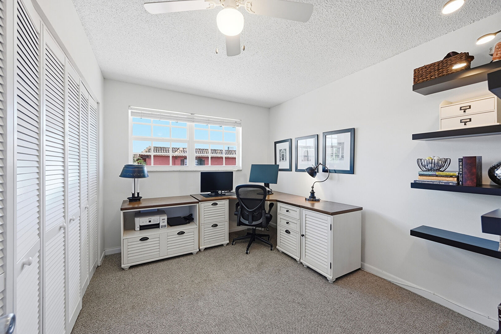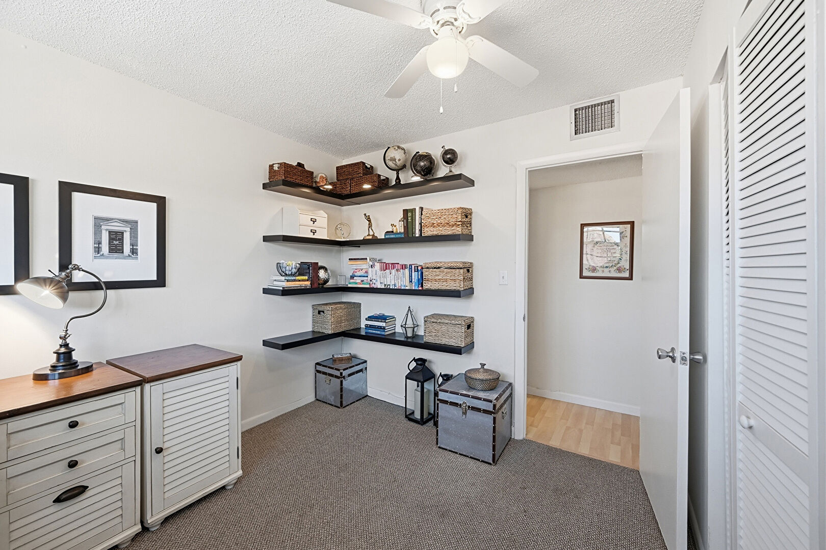 Baseboards Wall, Carpet, Ceiling Fan, Drywall, Natural Light, Office Area, Textured Ceiling, Vent, Baseboards Wall, Drywall, Notable Chandelier, Textured Ceiling