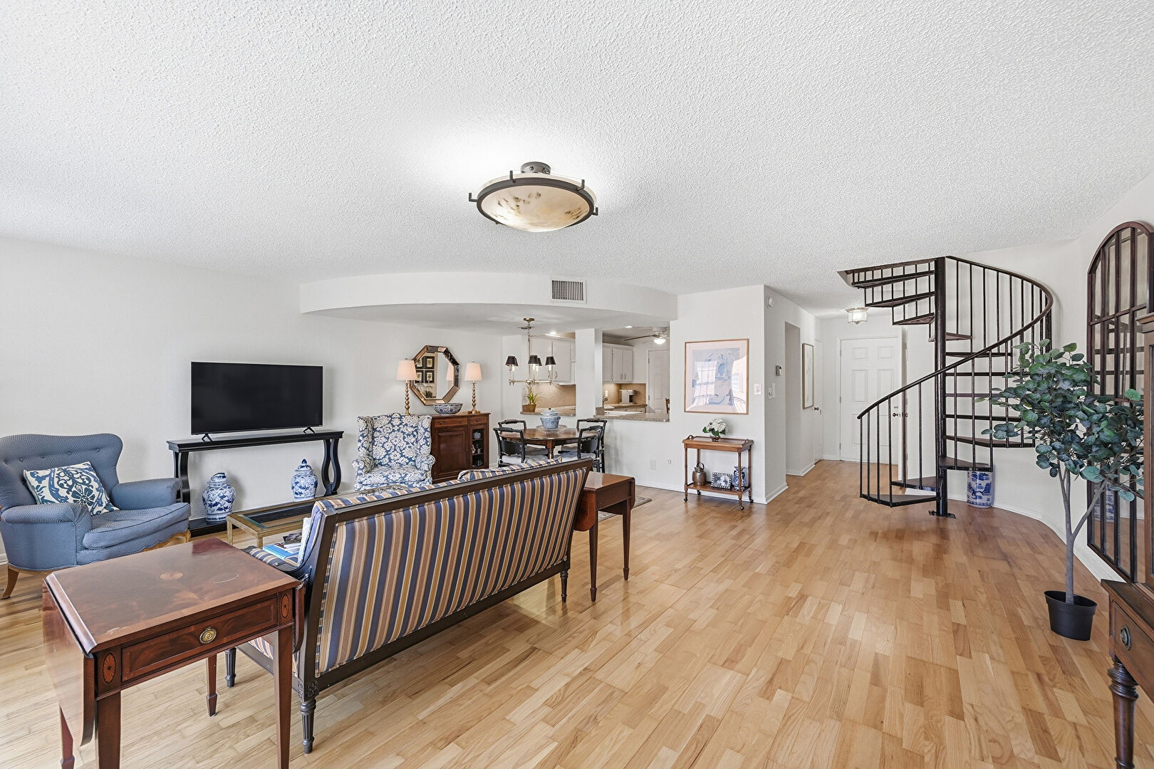 Drywall, Natural Light, Notable Chandelier, Stairs, Textured Ceiling, Wood Finish Floor, Baseboards Wall