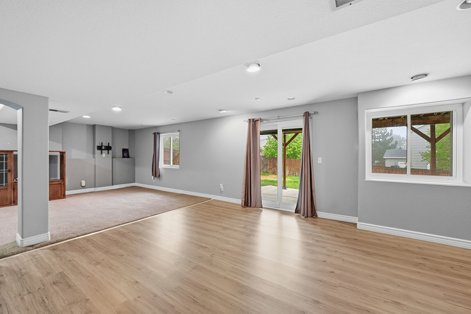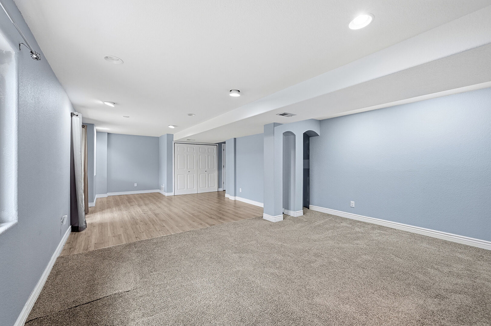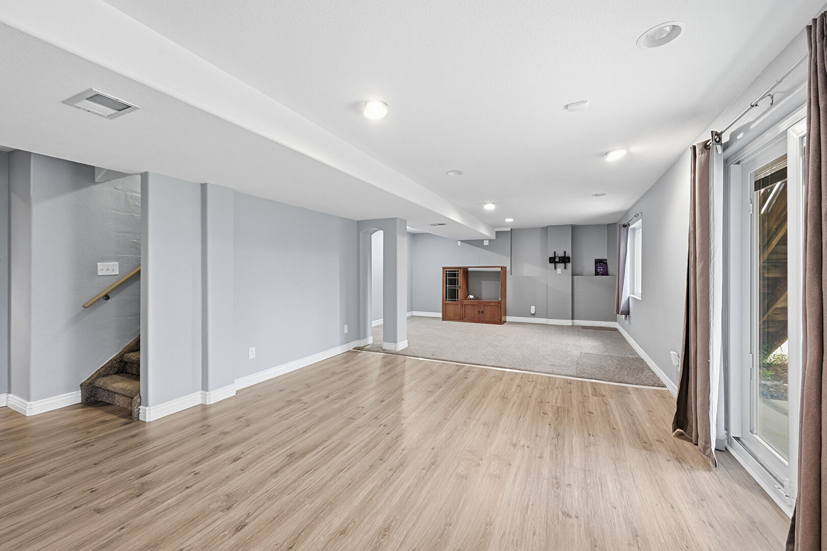 Arched Walkways, Baseboards Wall, Basement, Drywall, Natural Light, Recessed Lighting, Stairs, Vent, Wood Finish Floor, Baseboards Wall, Carpet, Drywall