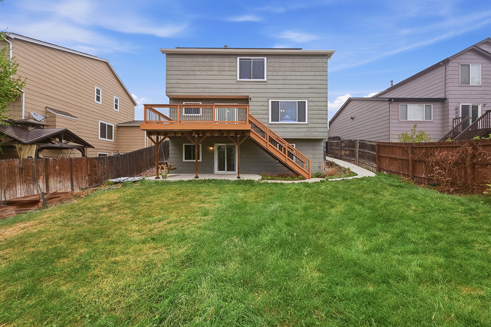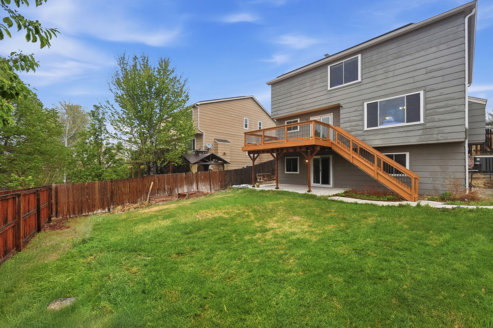 Central Ac, Deck, Downspout, Fence, Gutters, Horizontal Siding, Lawn, Patio, Satellite Dish, Stairs, Deck, Stairs