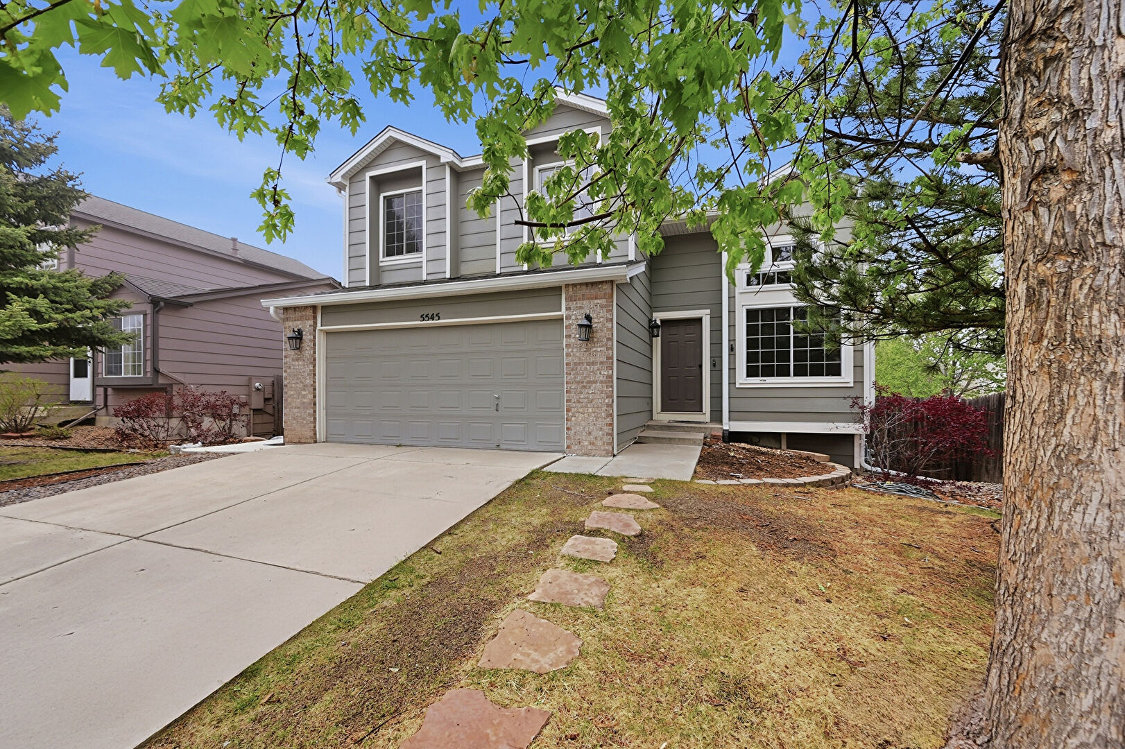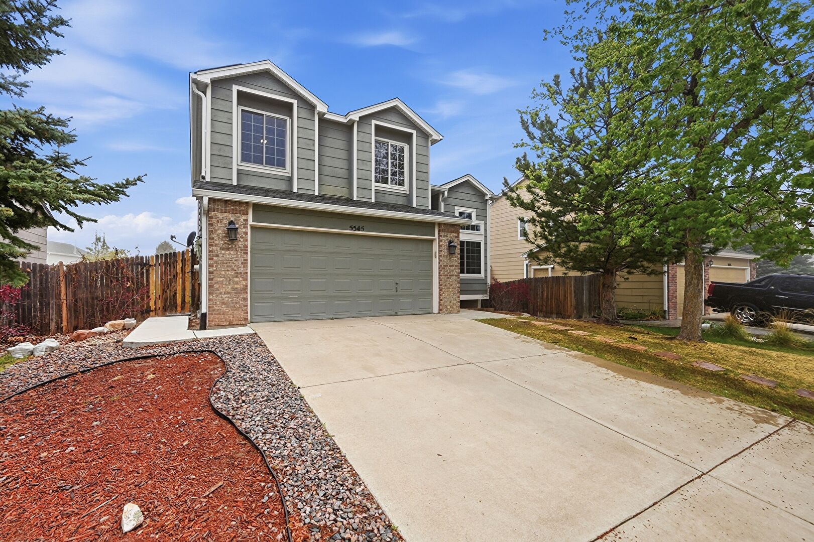 Brick Siding, Built In Garage, Concrete Foundation, Downspout, Driveway, Electric Meter, Fence, Gutters, Lawn, Satellite Dish, Horizontal Siding