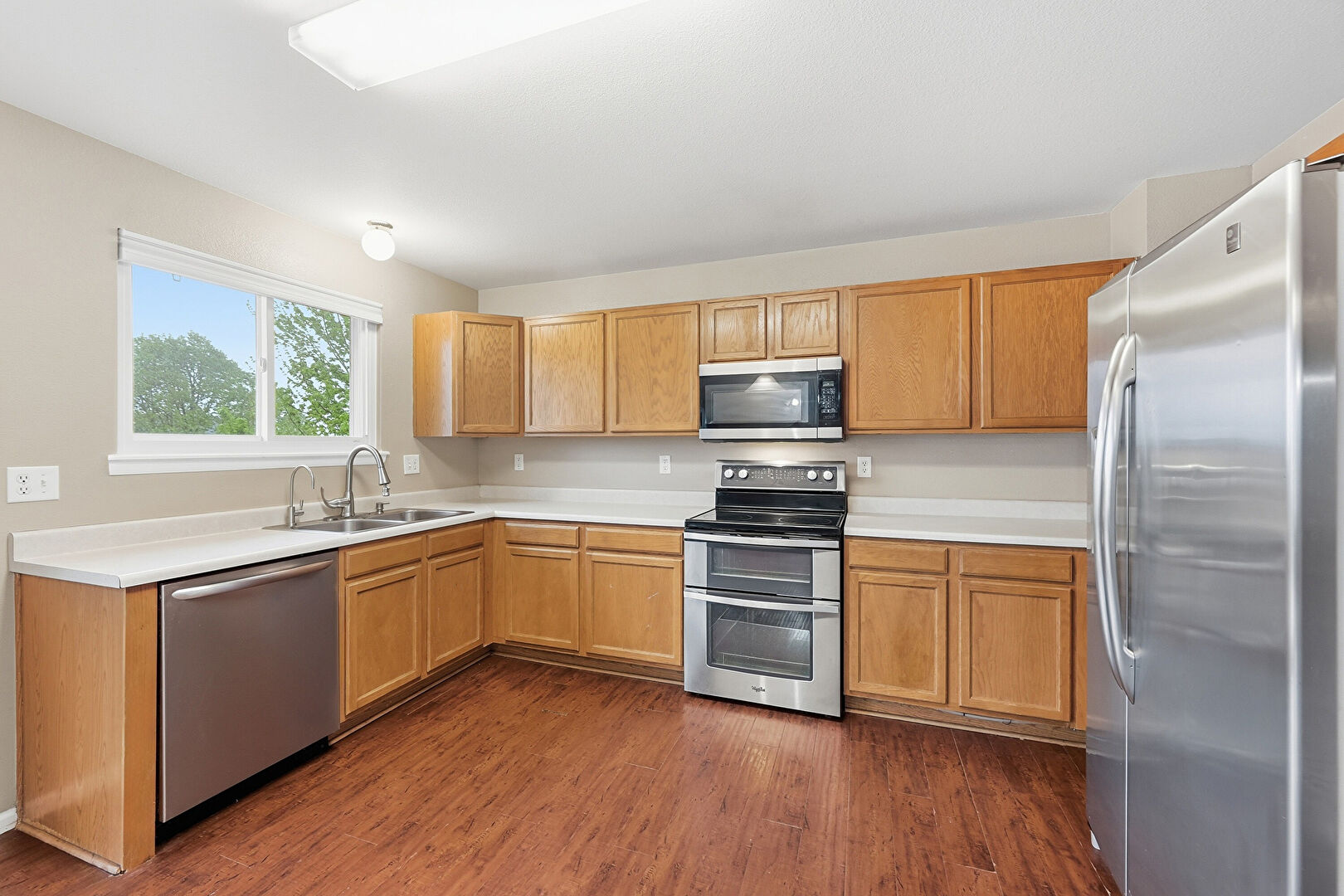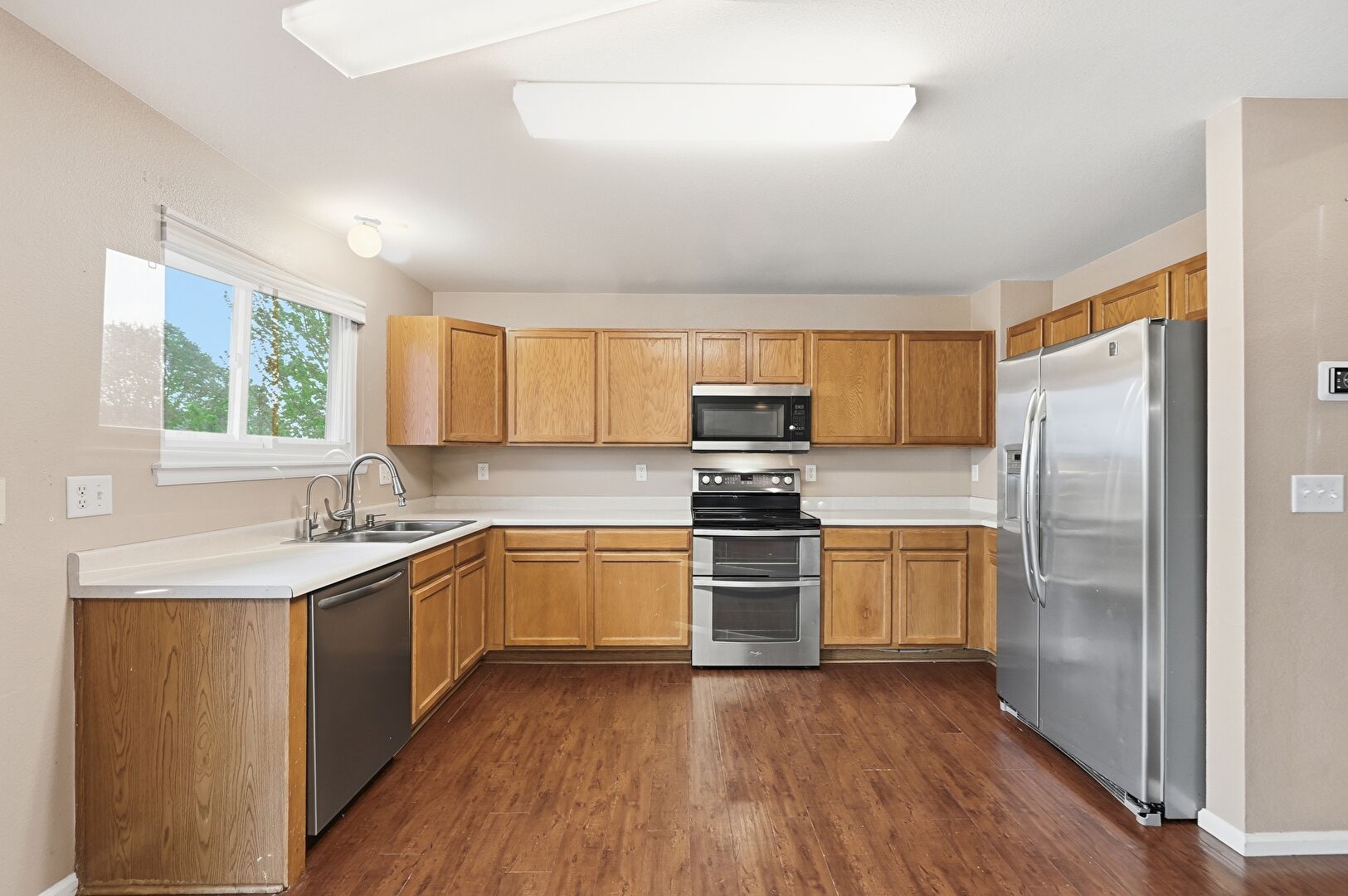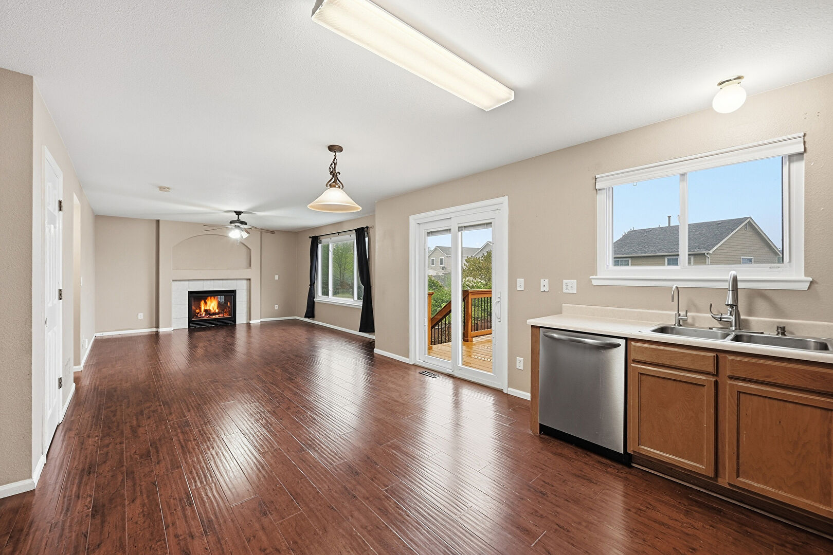 Baseboards Wall, Ceiling Fan, Drywall, Fireplace, Medium Brown Cabinets, Natural Light, Opens To Living Area, Pendant Lighting, Shaker Cabinets, U Shaped Kitchen, Wood Finish Floor, Drywall, Shaker Cabinets
