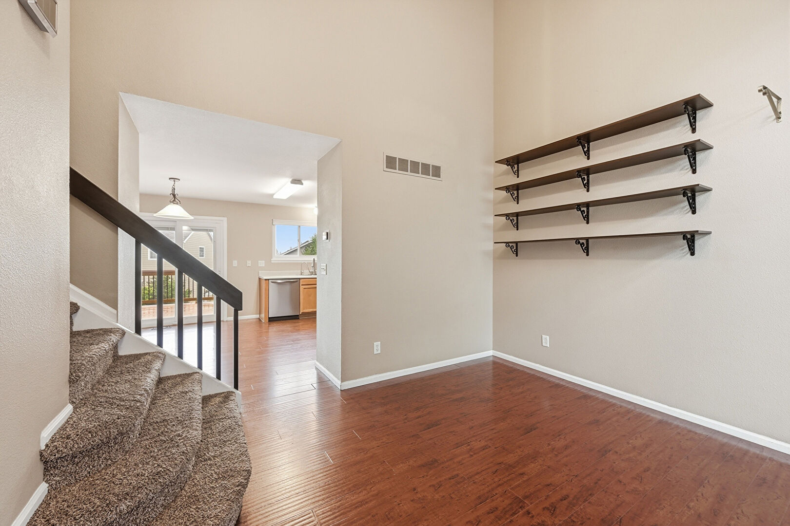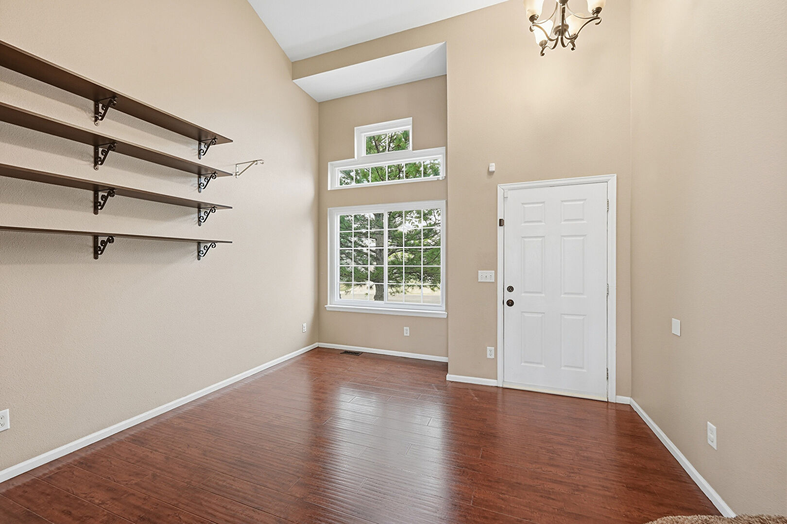 Baseboards Wall, Drywall, High Ceiling, Natural Light, Notable Chandelier, Vaulted Ceiling, Vent, Wood Finish Floor, Drywall, Stairs