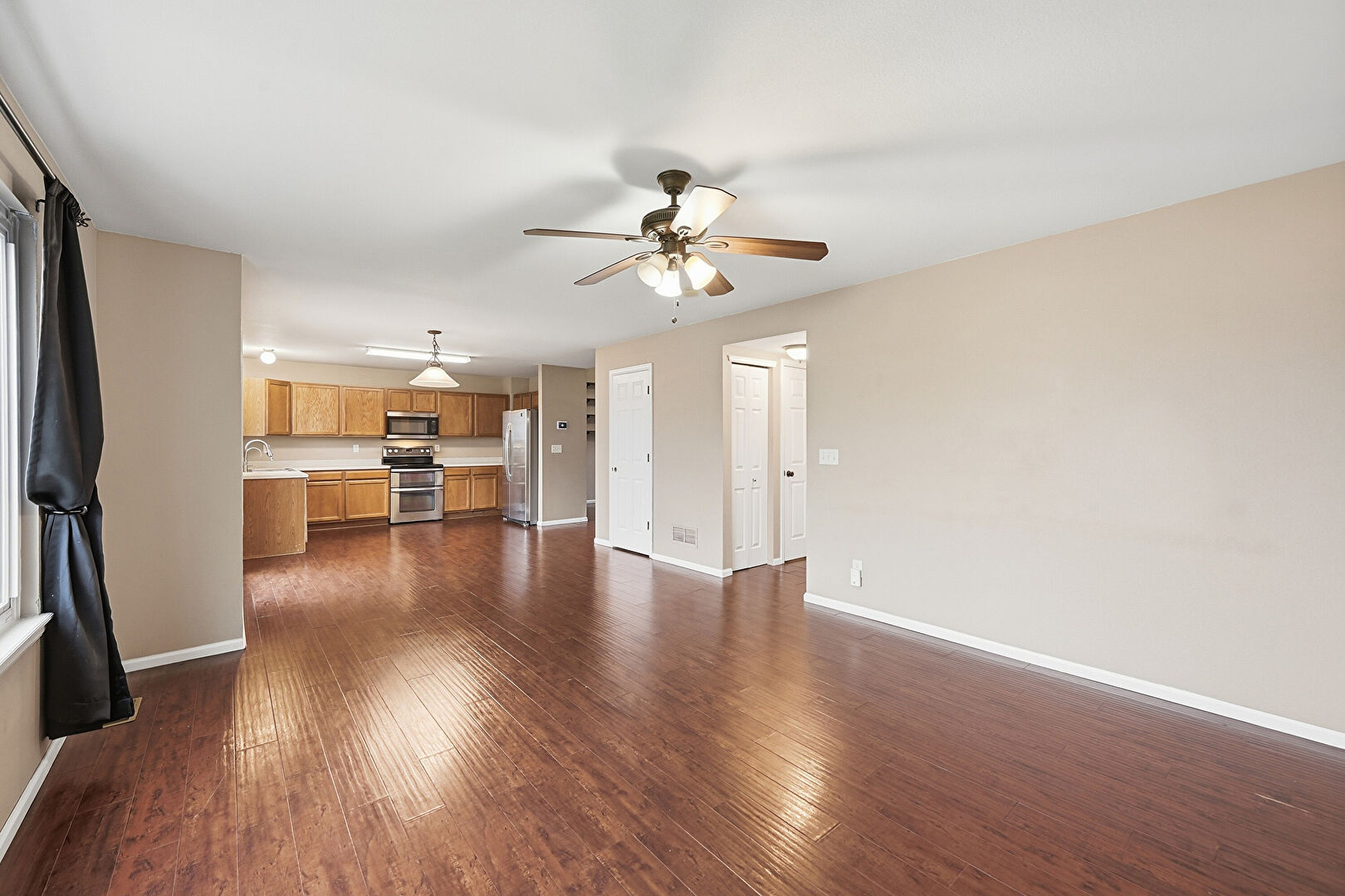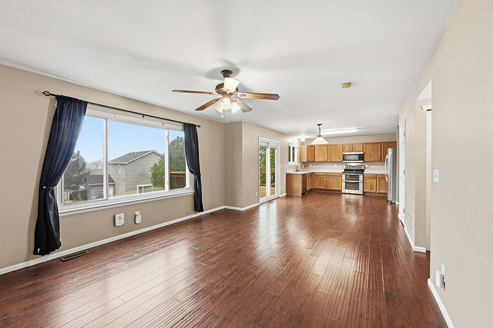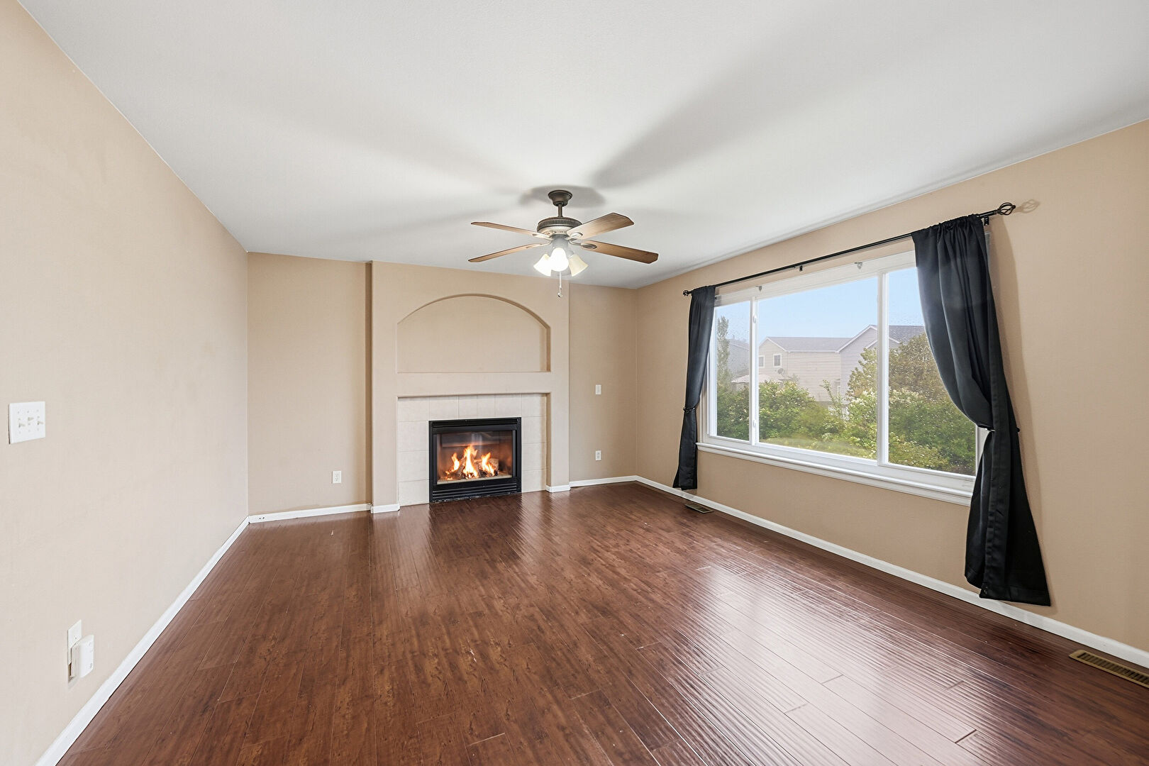Baseboards Wall, Ceiling Fan, Drywall, Fireplace, Natural Light, Smoke Carbon Monoxide Detector, Vent, Wood Finish Floor, Baseboards Wall, Drywall, Natural Light