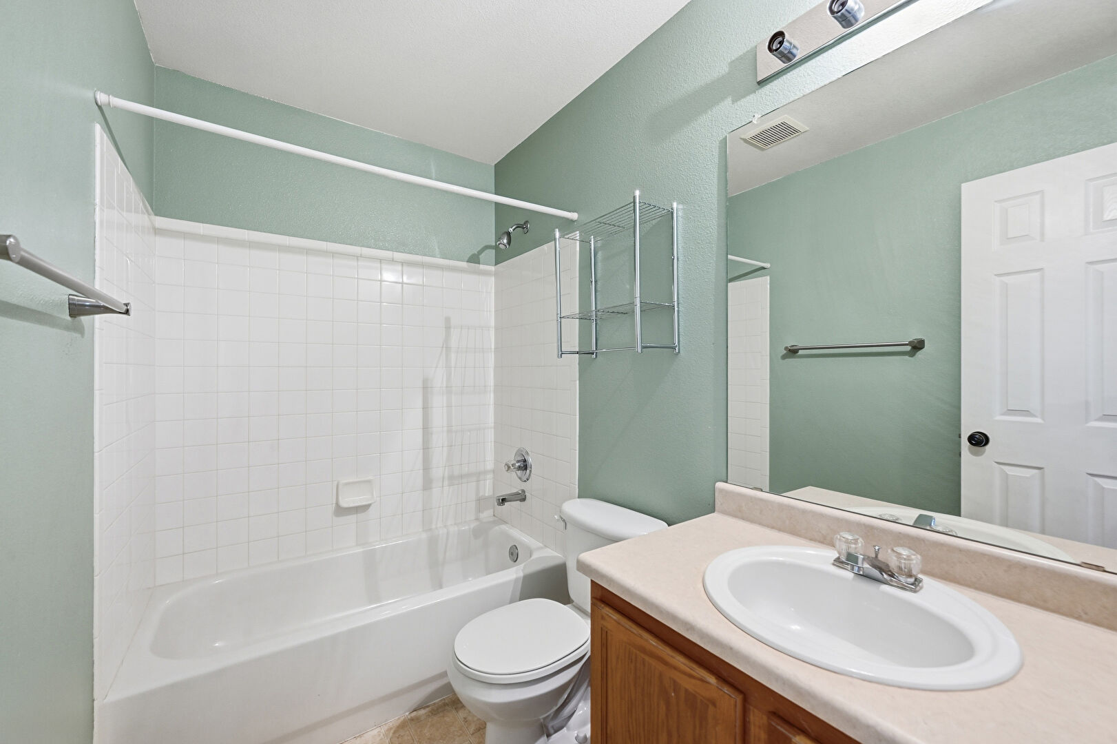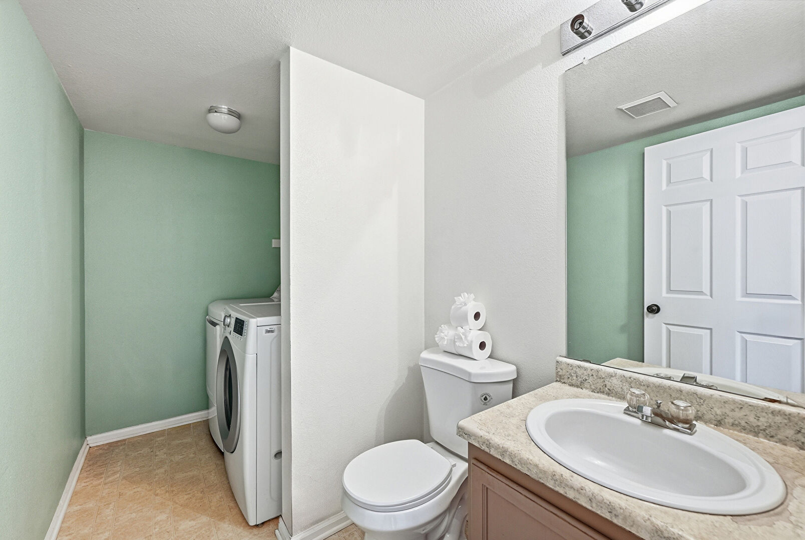 Baseboards Wall, Combined Bath Shower, Drywall, Full Bathroom, Half Bathroom, Laundry, Textured Ceiling, Vanity, Vent, Tile Floor, Vanity