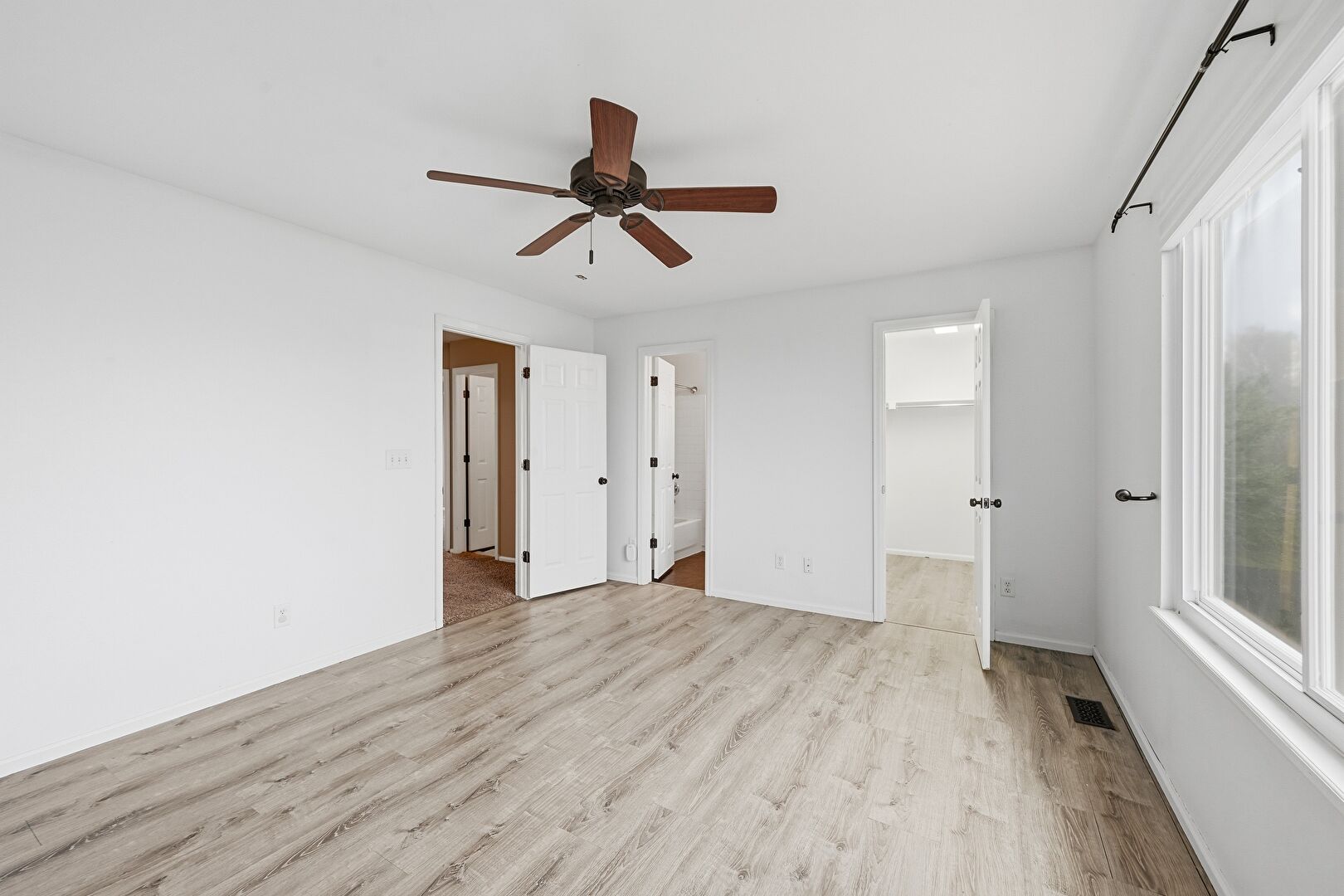 Baseboards Wall, Ceiling Fan, Drywall, Ensuite Bathroom, Natural Light, Vent, Walk In Closet, Wood Finish Floor, Baseboards Wall, Natural Light