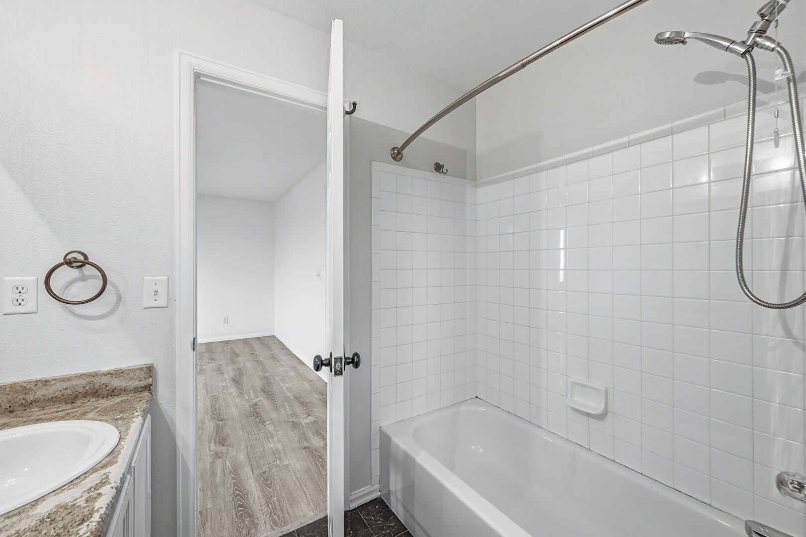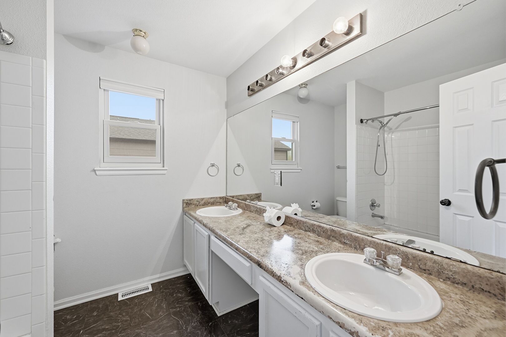 Baseboards Wall, Combined Bath Shower, Double Vanity, Drywall, Full Bathroom, Natural Light, Vanity, Vent, Wood Finish Floor, Drywall, Full Bathroom