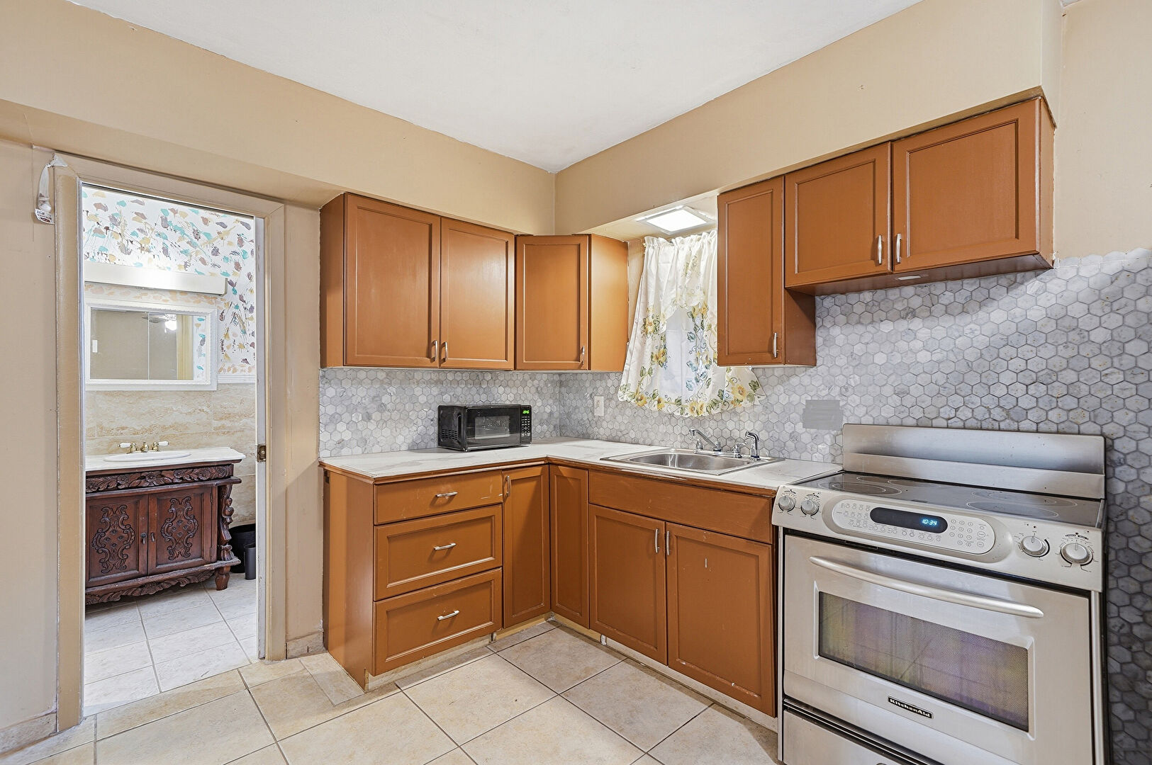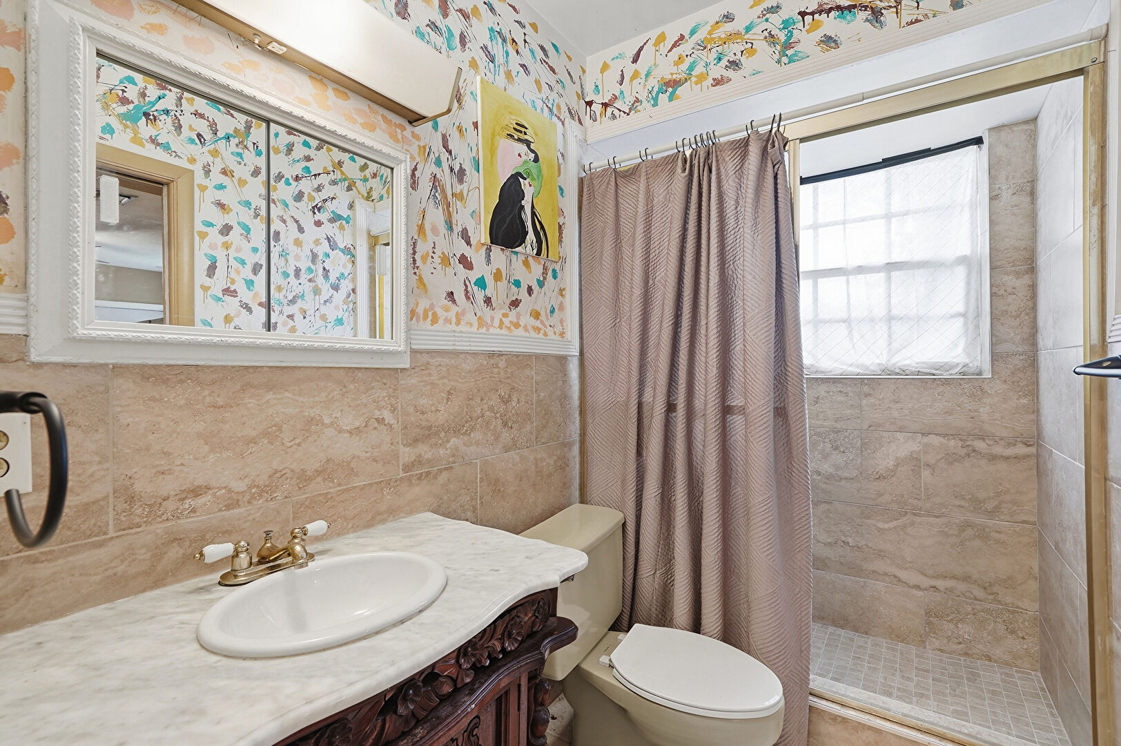 Full Bathroom, Tile Wall, Vanity, Wainscot Wall, Wallpaper Wall, Natural Light