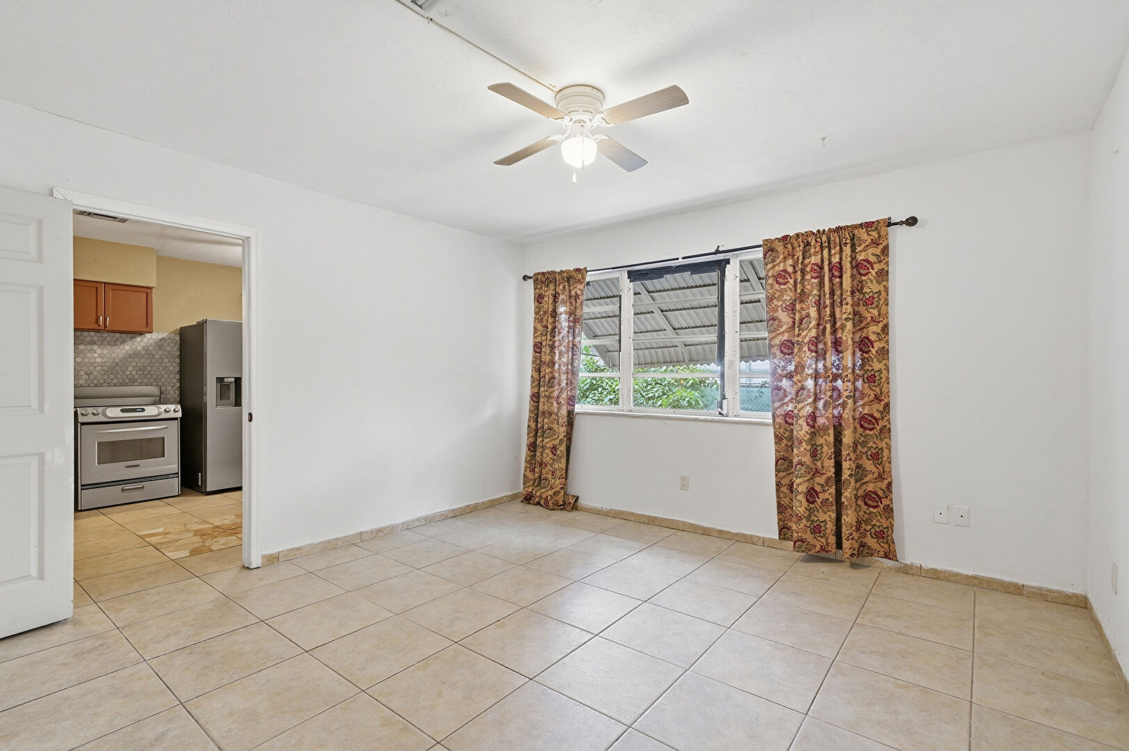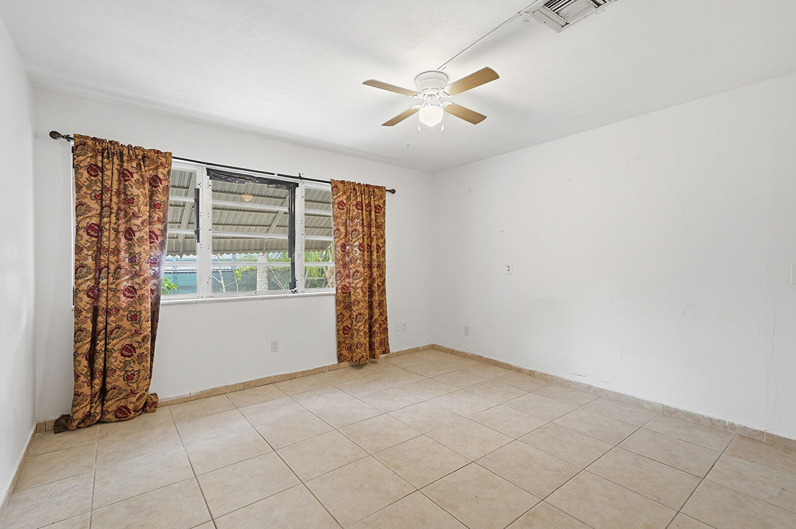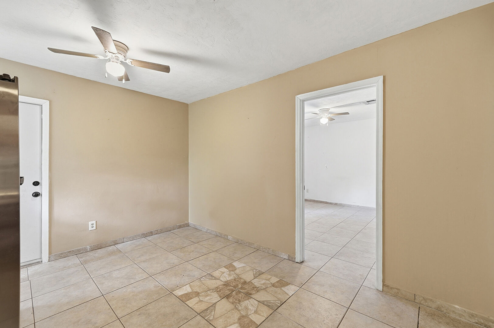 Baseboards Wall, Ceiling Fan, Drywall, Textured Ceiling, Tile Floor