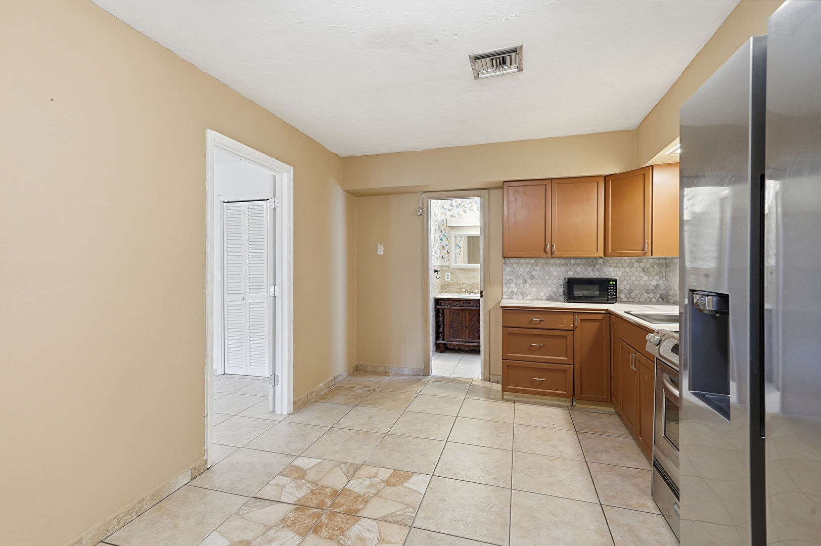 Baseboards Wall, Ceiling Fan, Drywall, Medium Brown Cabinets, Natural Light, Shaker Cabinets, Tile Floor, Vent, Medium Brown Cabinets, Shaker Cabinets