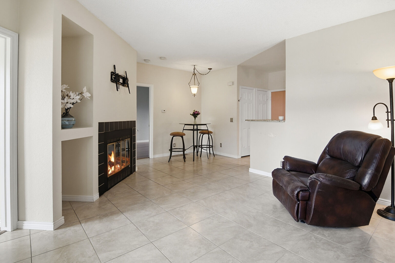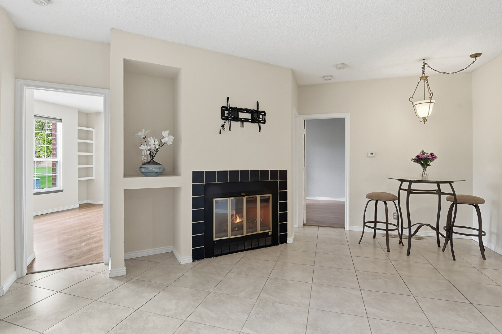 Baseboards Wall, Built In Shelves, Drywall, Fireplace, Galley Kitchen, Textured Ceiling, Tile Floor, Fireplace, Natural Light, Track Lighting