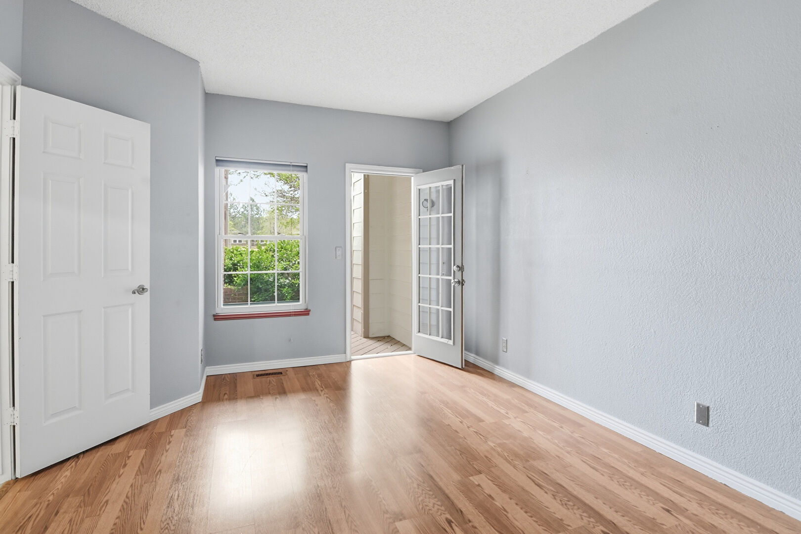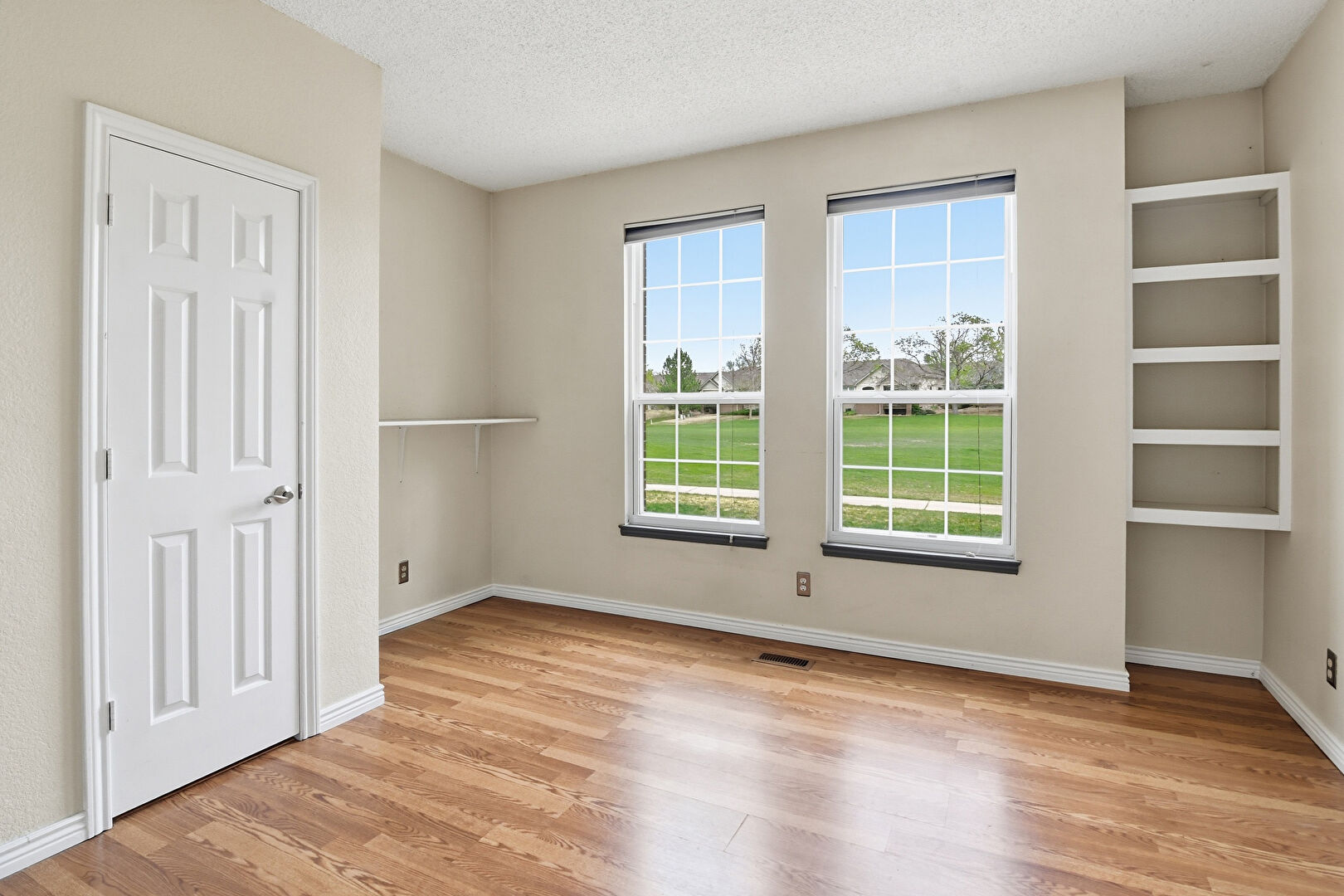Baseboards Wall, Built In Shelves, Drywall, French Doors, Natural Light, Textured Ceiling, Textured Wall, Vent, Wood Finish Floor, Vent, Wood Finish Floor