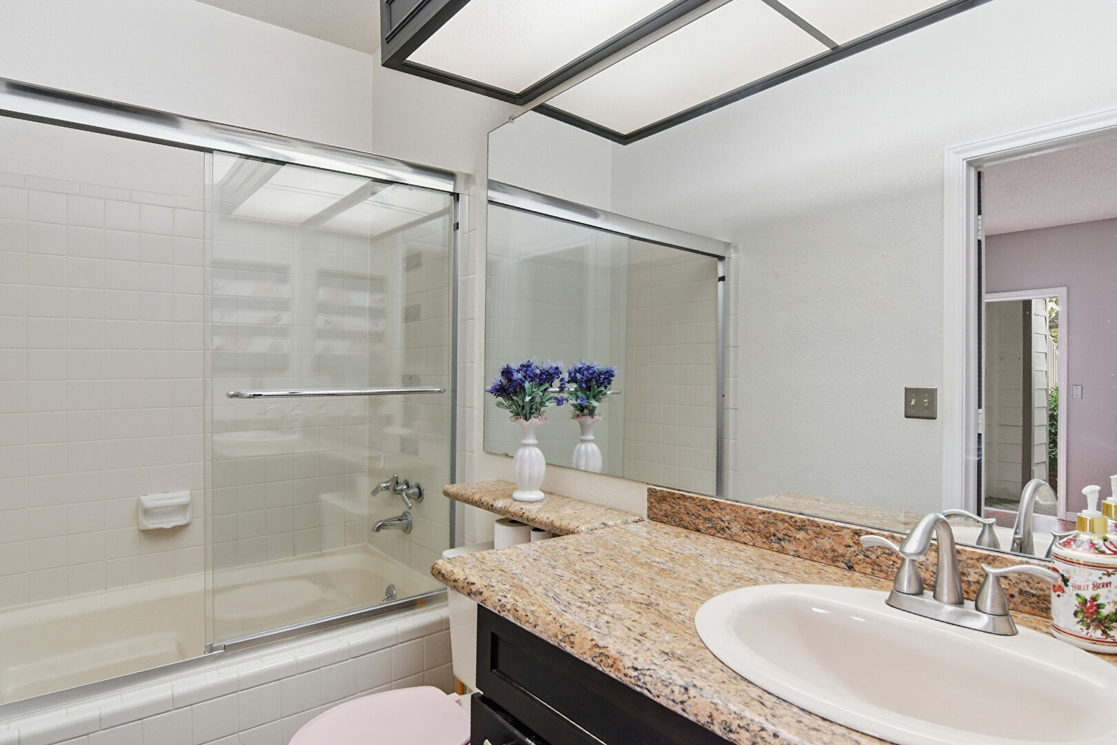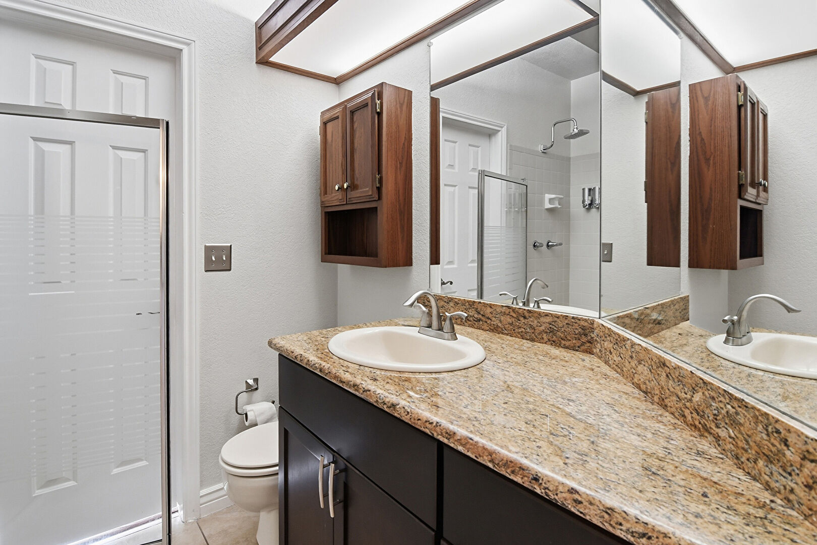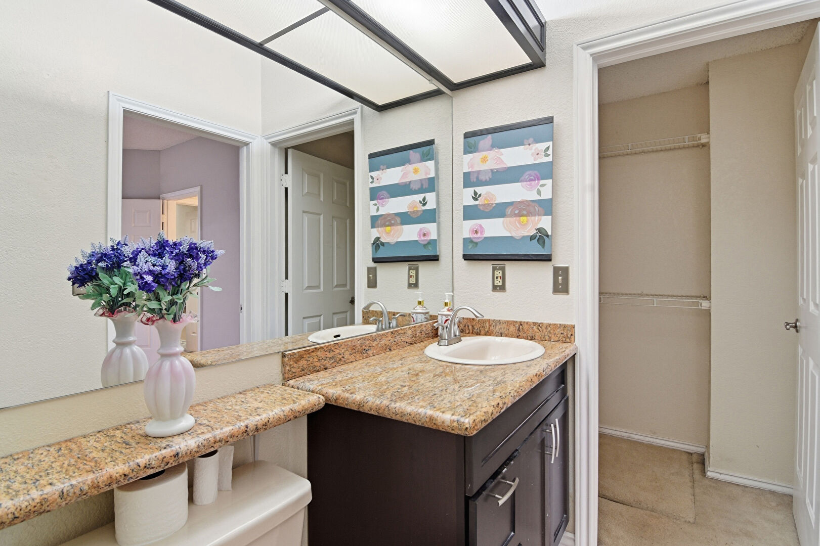 Baseboards Wall, Carpet, Closet, Combined Bath Shower, Drywall, Full Bathroom, Textured Wall, Vanity, Tile Floor, Vanity, Walk In Closet