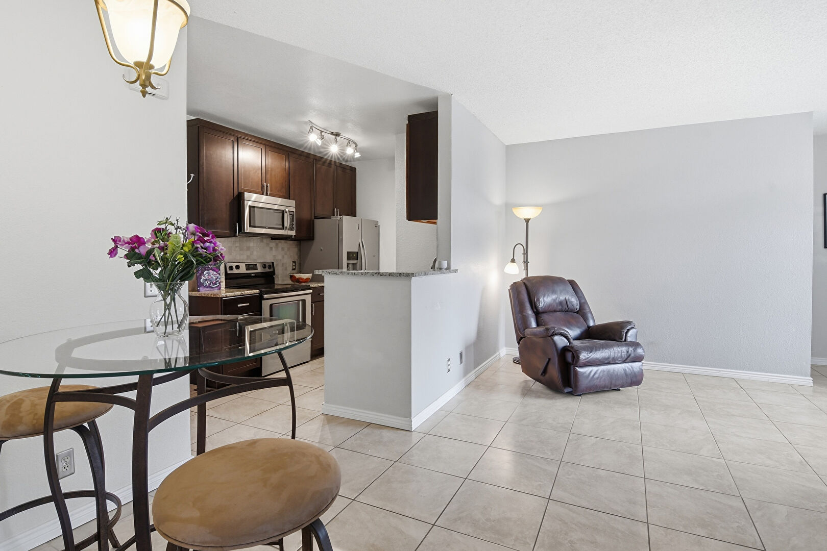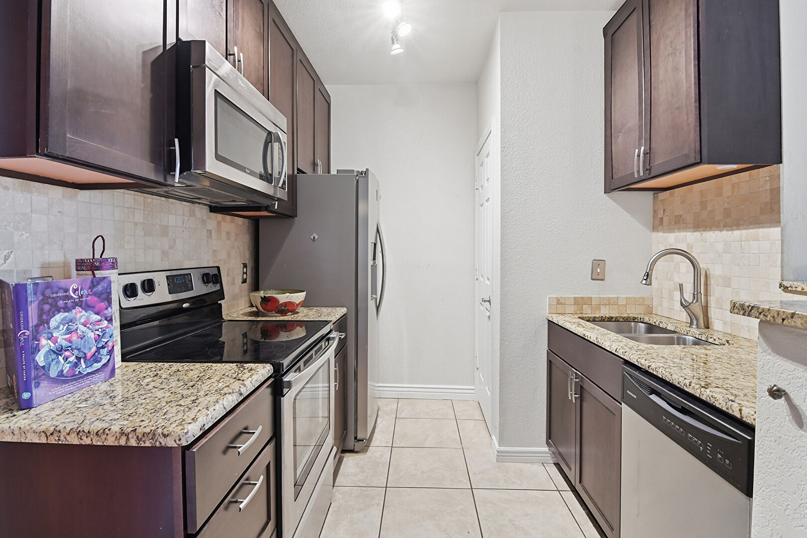Baseboards Wall, Galley Kitchen, Shaker Cabinets, Stone Countertops, Textured Wall, Tile Floor, Dark Brown Cabinets