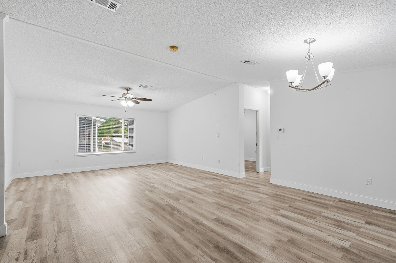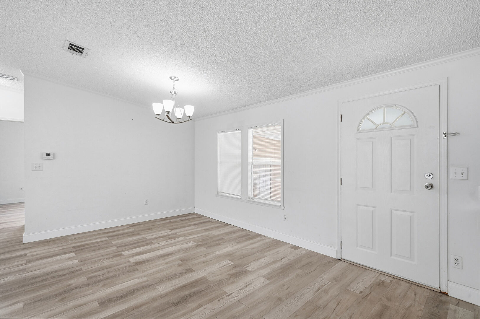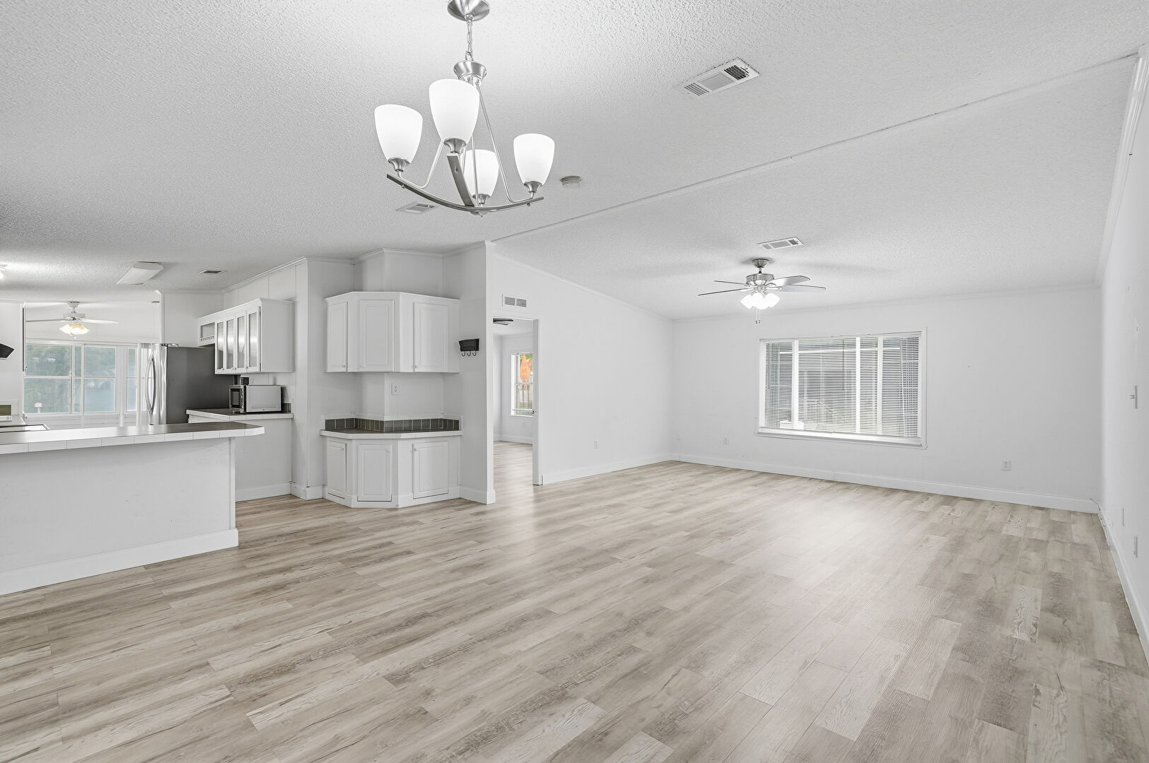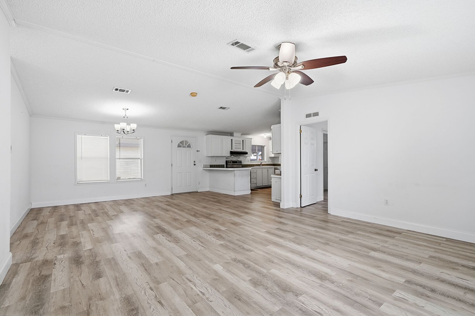Baseboards Wall, Ceiling Fan, Crown Molding, Drywall, Natural Light, Notable Chandelier, Textured Ceiling, Vaulted Ceiling, Vent, Wood Finish Floor, Crown Molding, Natural Light, Textured Ceiling