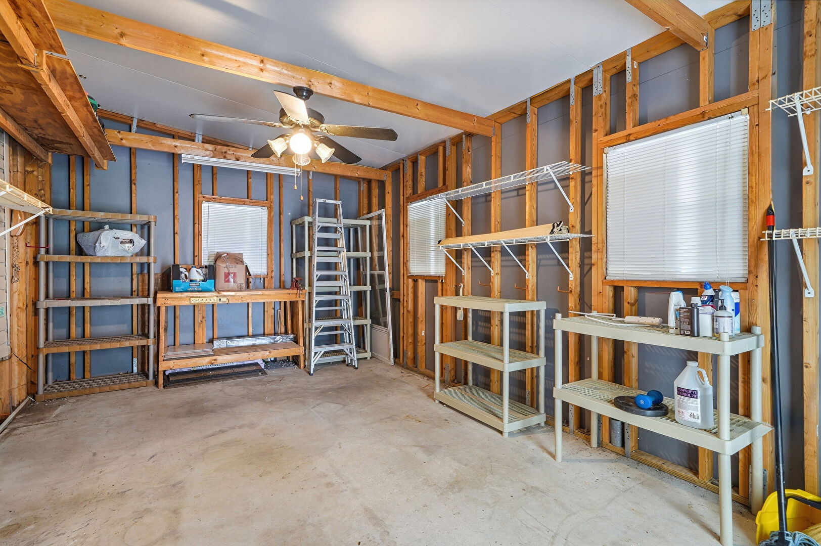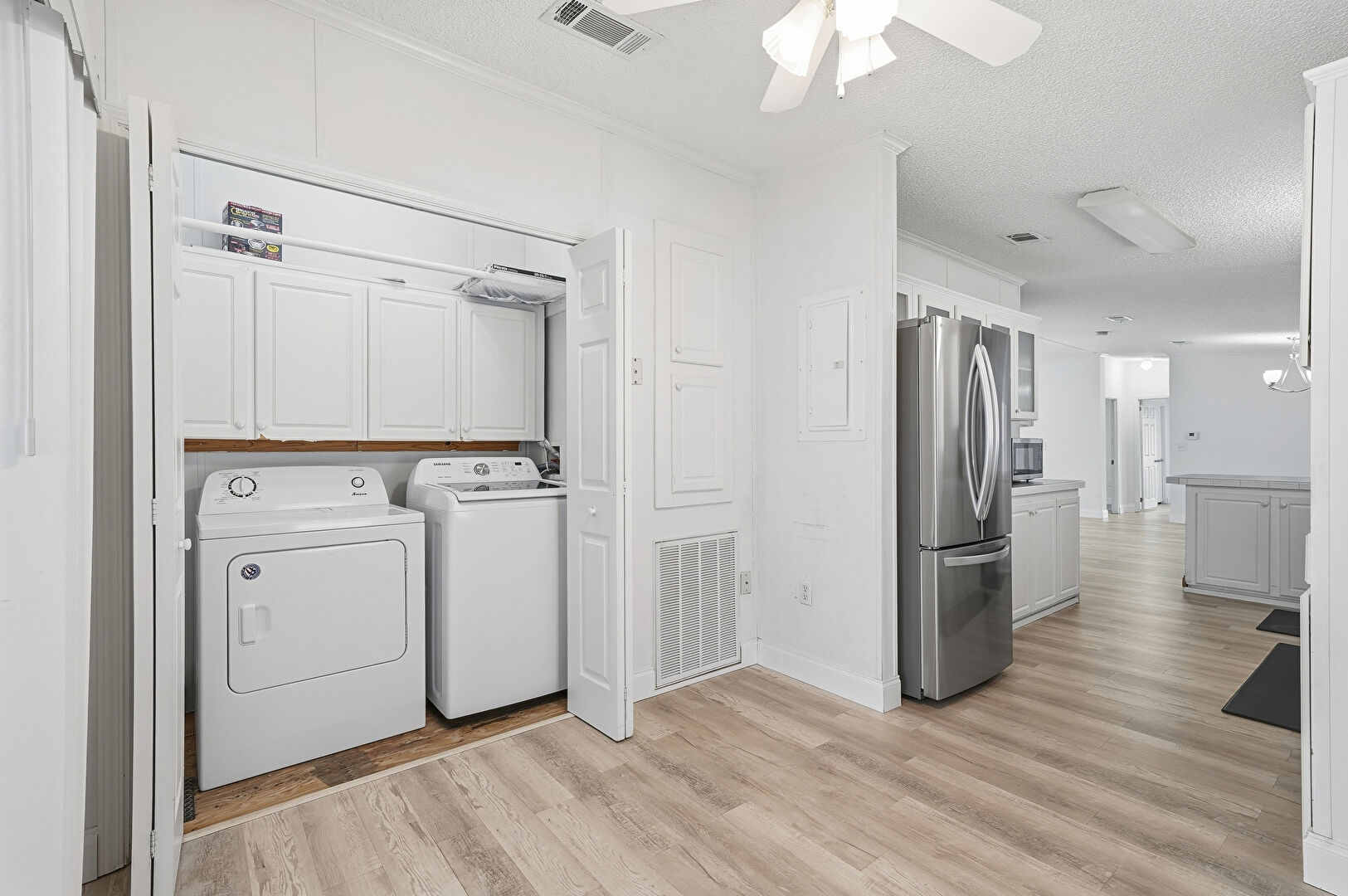Baseboards Wall, Ceiling Fan, Drywall, Laundry, Textured Ceiling, Wood Finish Floor, Vent