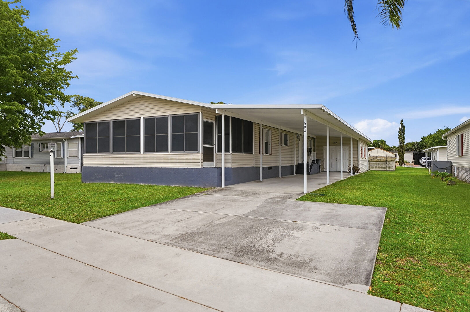 Attached Carport, Central Ac, Crawl Space, Downspout, Driveway, Horizontal Siding, Lawn, Parking Pad, Porch, Skirt, Sunroom, Gutters, Lawn, Sunroom
