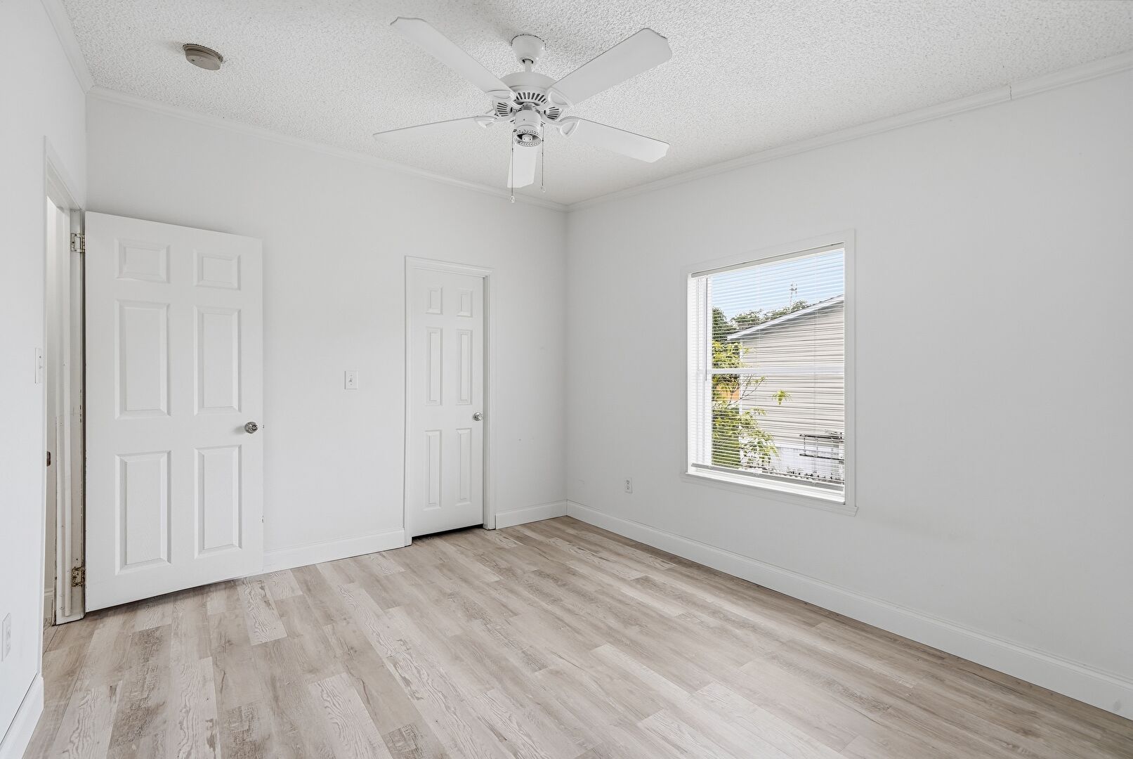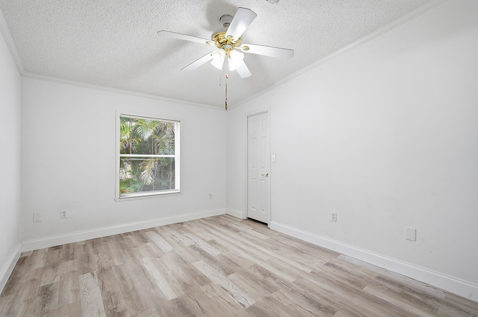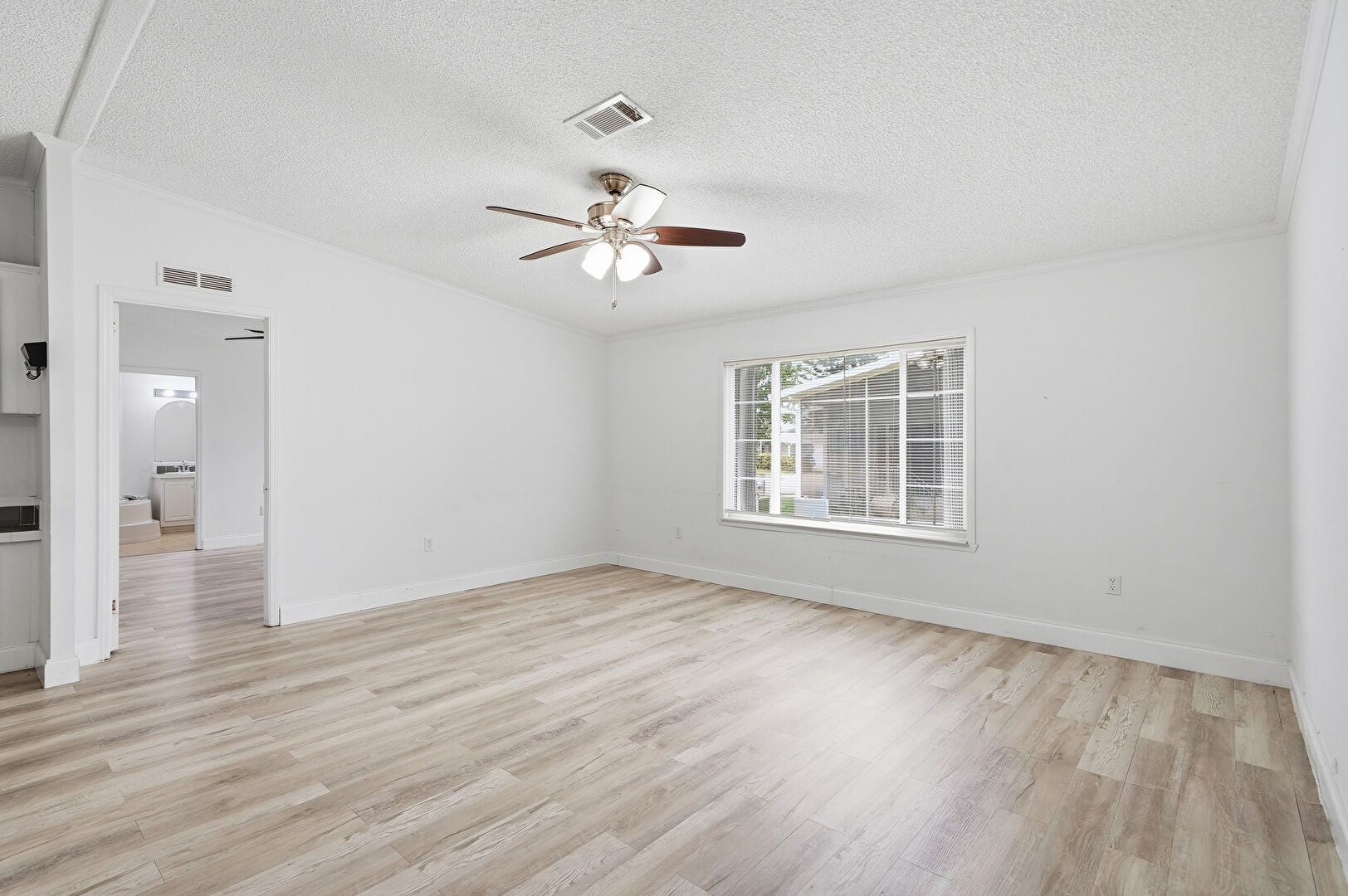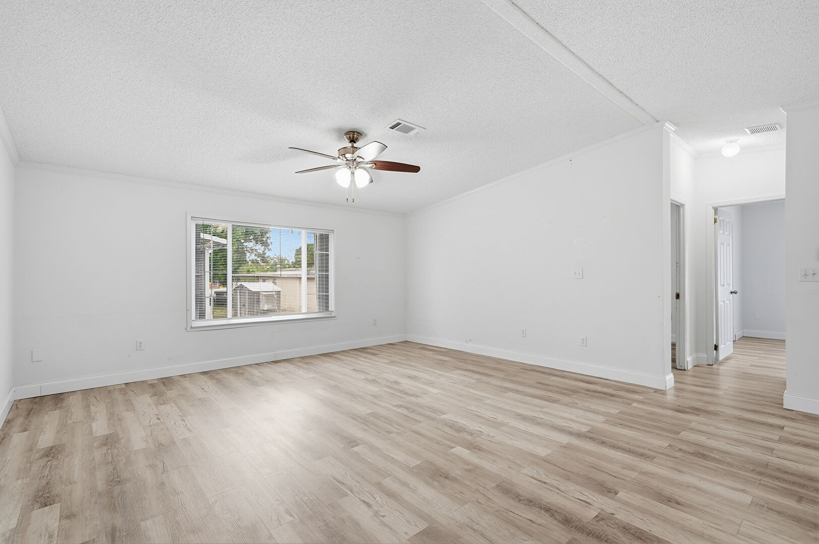 Baseboards Wall, Ceiling Fan, Crown Molding, Drywall, Natural Light, Textured Ceiling, Wood Finish Floor