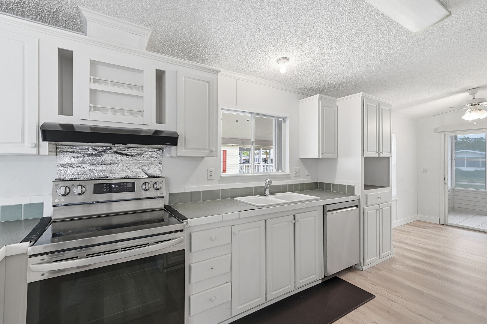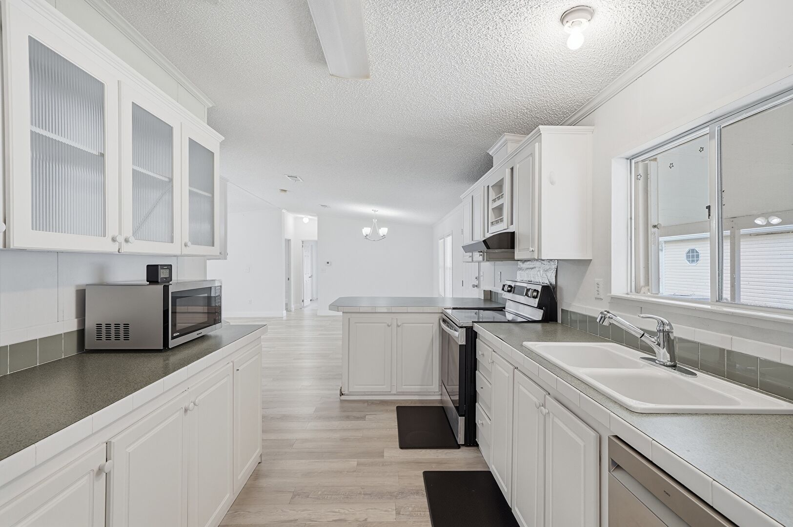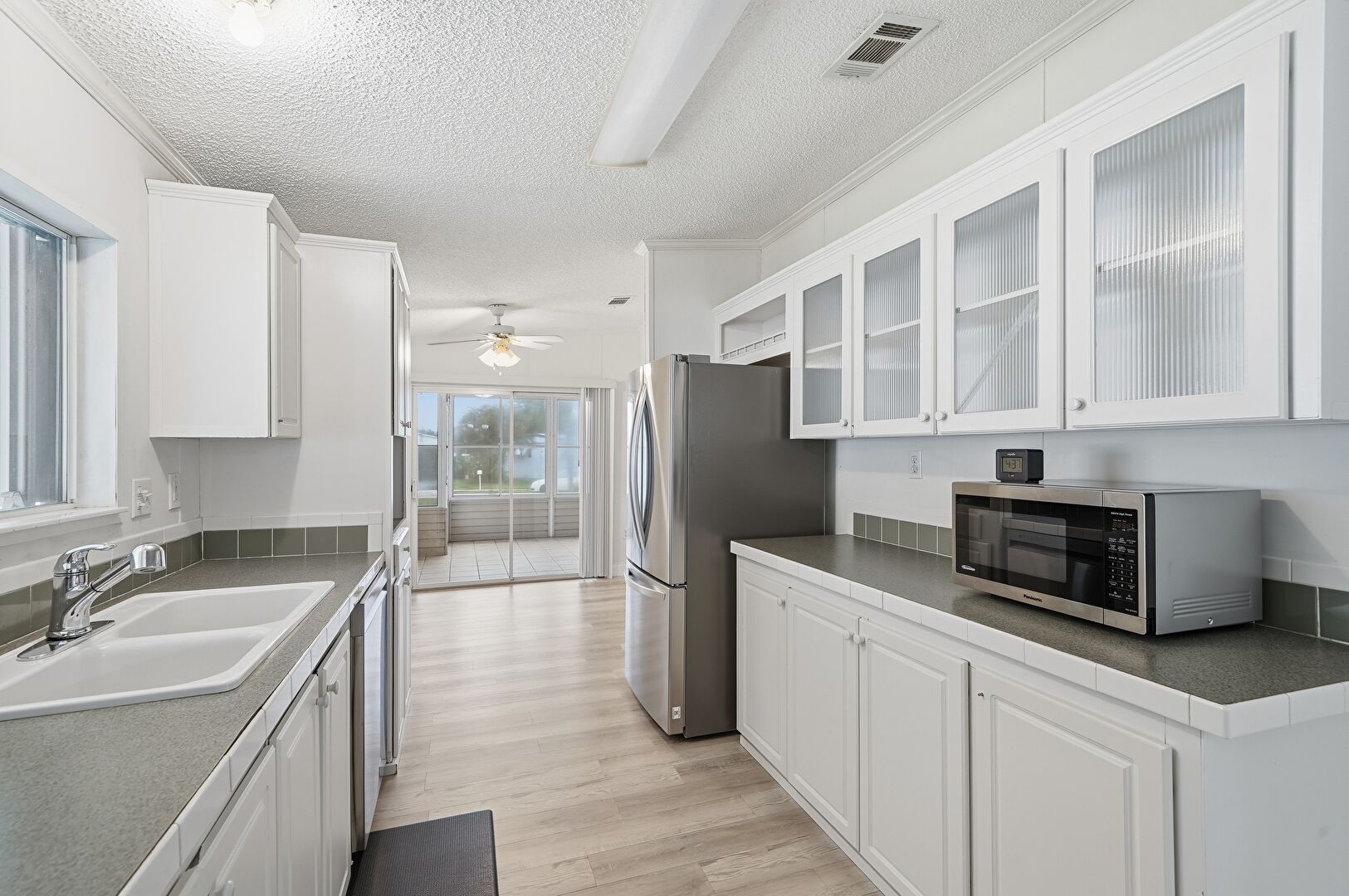 Baseboards Wall, Ceiling Fan, Crown Molding, Crown Molding Cabinets, Drywall, Glass Insert Cabinets, Kitchen Peninsula, Natural Light, Raised Cabinets, Textured Ceiling, Tile Countertops, Vaulted Ceiling, Vent, Wood Finish Floor, Notable Chandelier, Wood Finish Floor