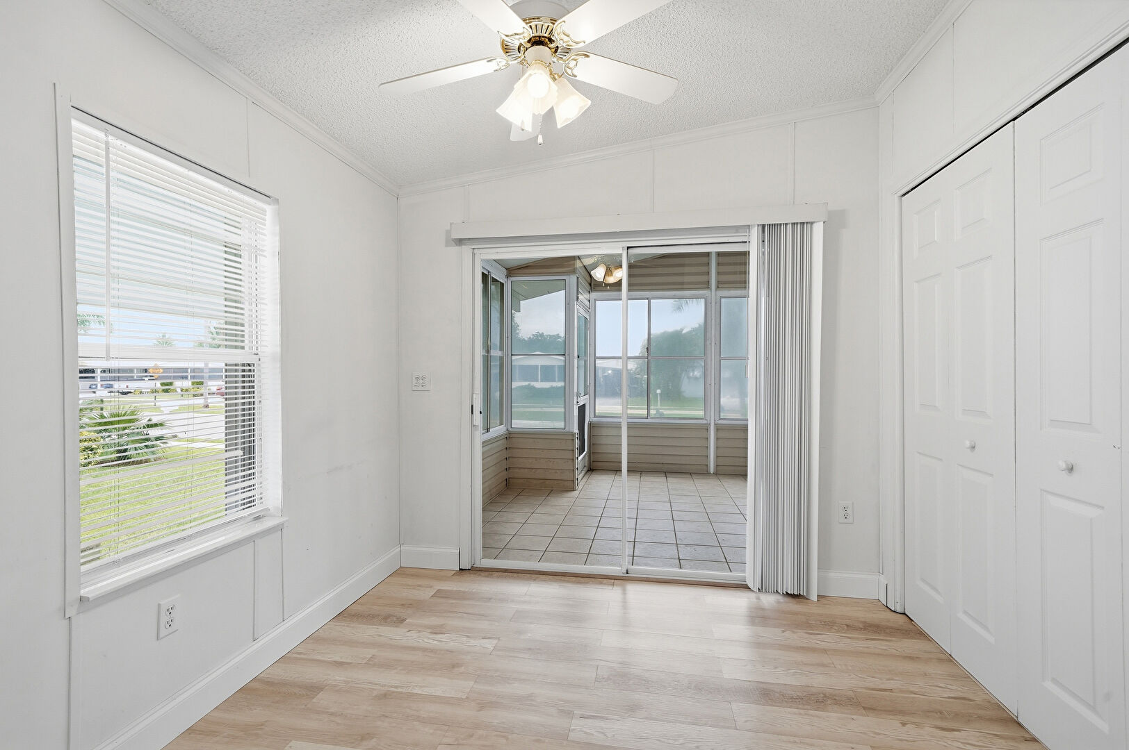 Baseboards Wall, Ceiling Fan, Crown Molding, Drywall, Natural Light, Sunroom, Textured Ceiling, Vaulted Ceiling, Wood Finish Floor