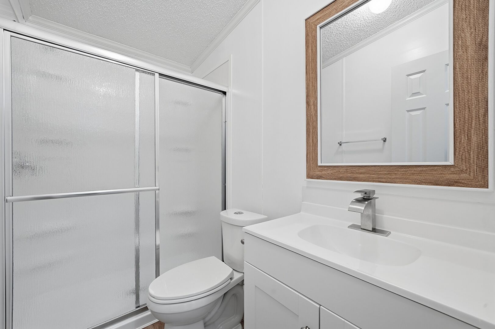 Full Bathroom, Textured Ceiling, Vanity, Crown Molding