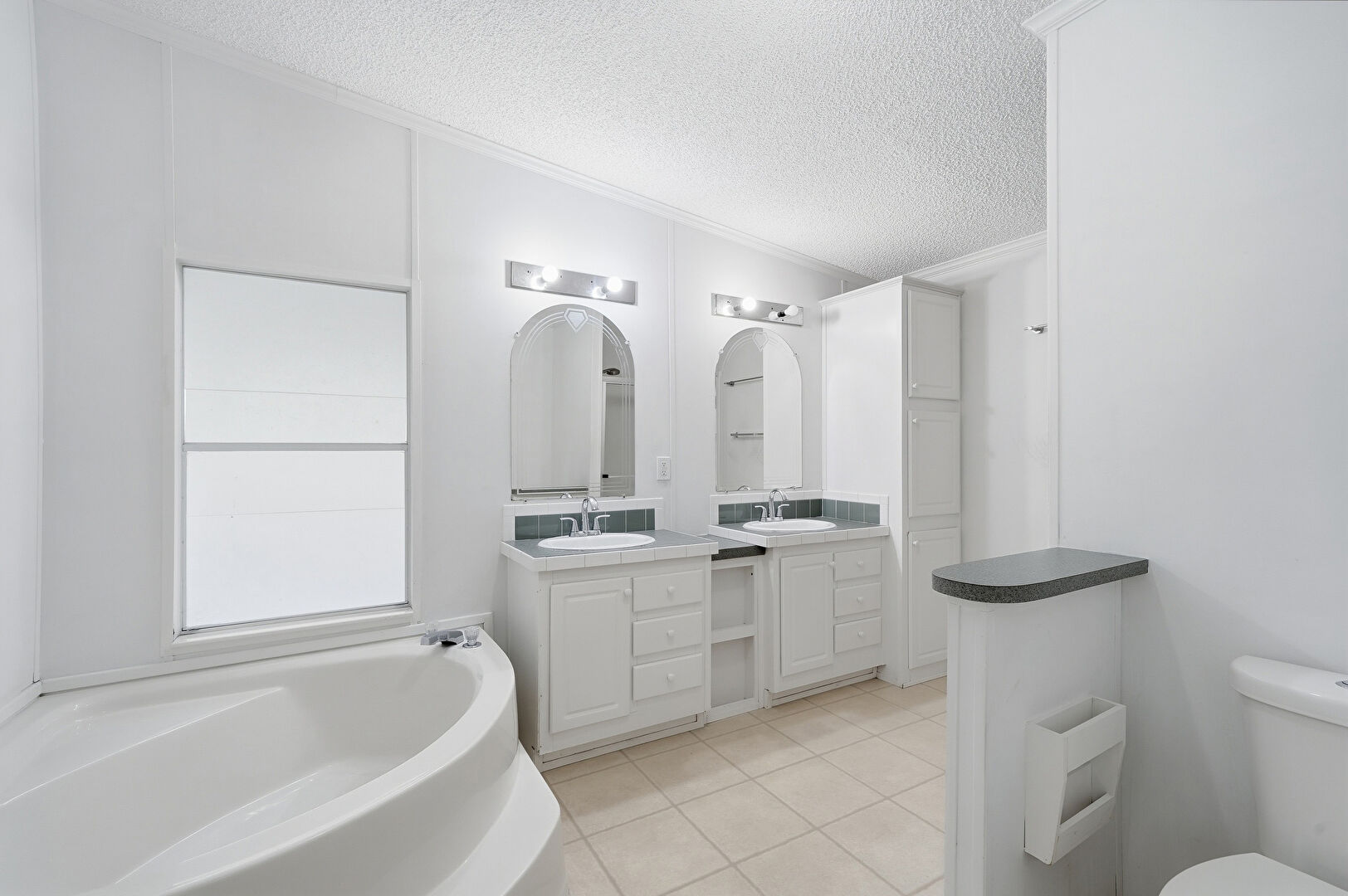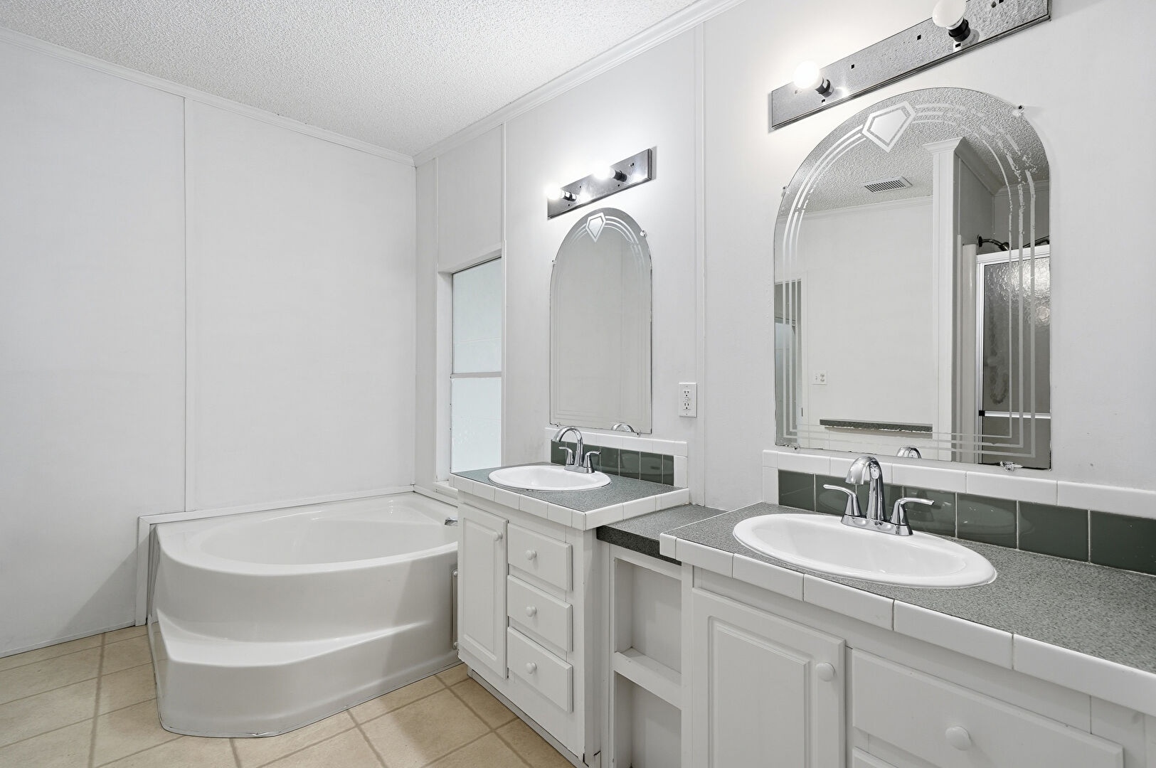 Crown Molding, Double Vanity, Drywall, Full Bathroom, Natural Light, Paneling Wall, Textured Ceiling, Tile Floor, Two Single Vanities, Vaulted Ceiling, Vent, Full Bathroom, Textured Ceiling