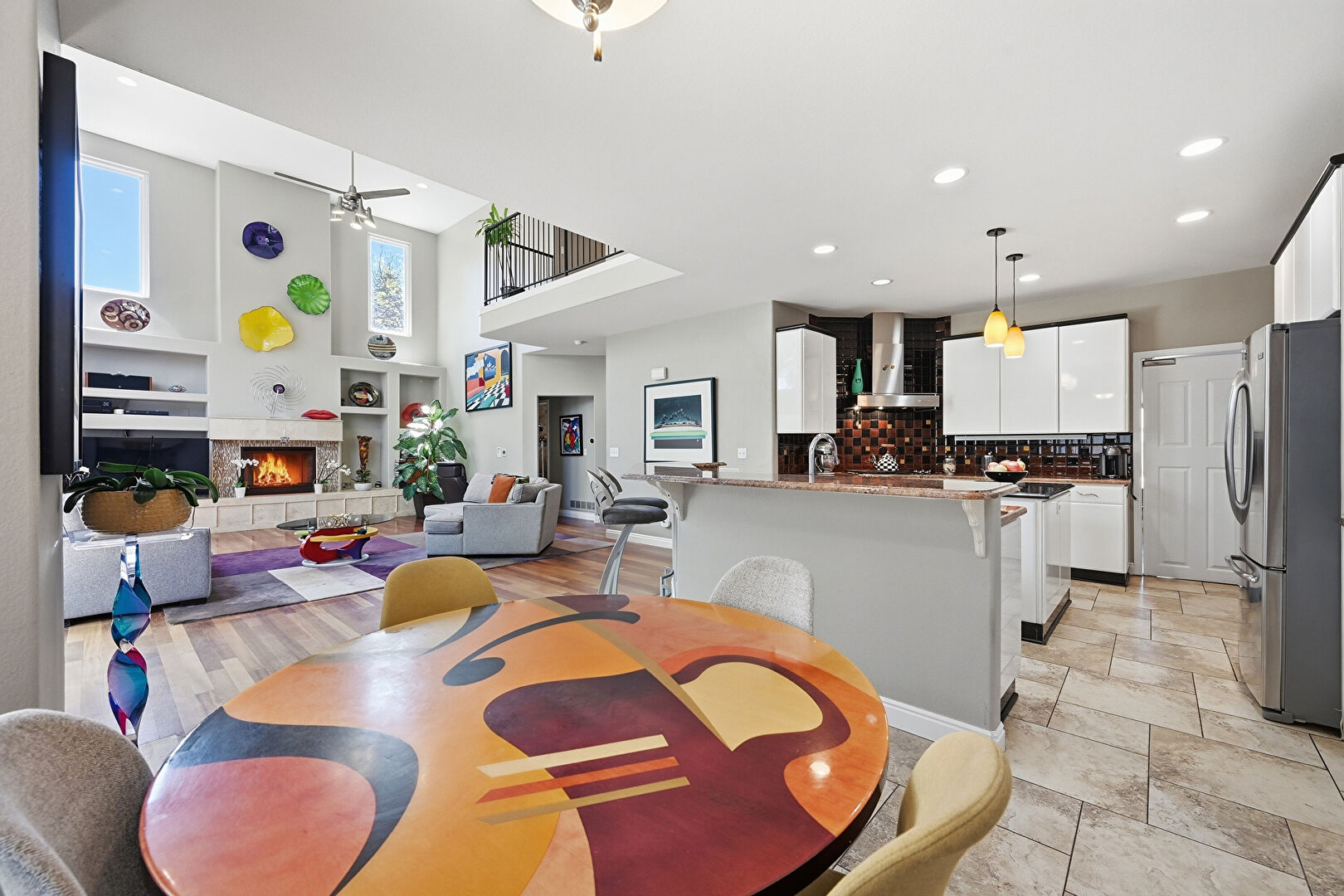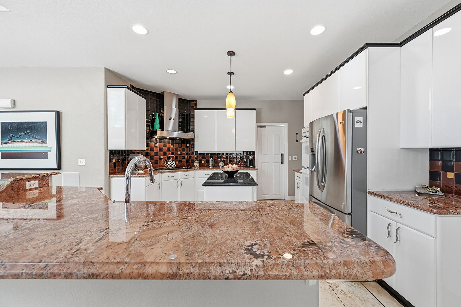 Baseboards Wall, Built In Shelves, Ceiling Fan, Drywall, Flat Panel Cabinets, G Shaped Kitchen, Kitchen Bar, Kitchen Island, Kitchen Peninsula, Multiple Kitchen Islands, Natural Light, Opens To Living Area, Pendant Lighting, Recessed Lighting, Stone Countertops, Vent, Fireplace, Kitchen Peninsula, Natural Light, Stone Countertops