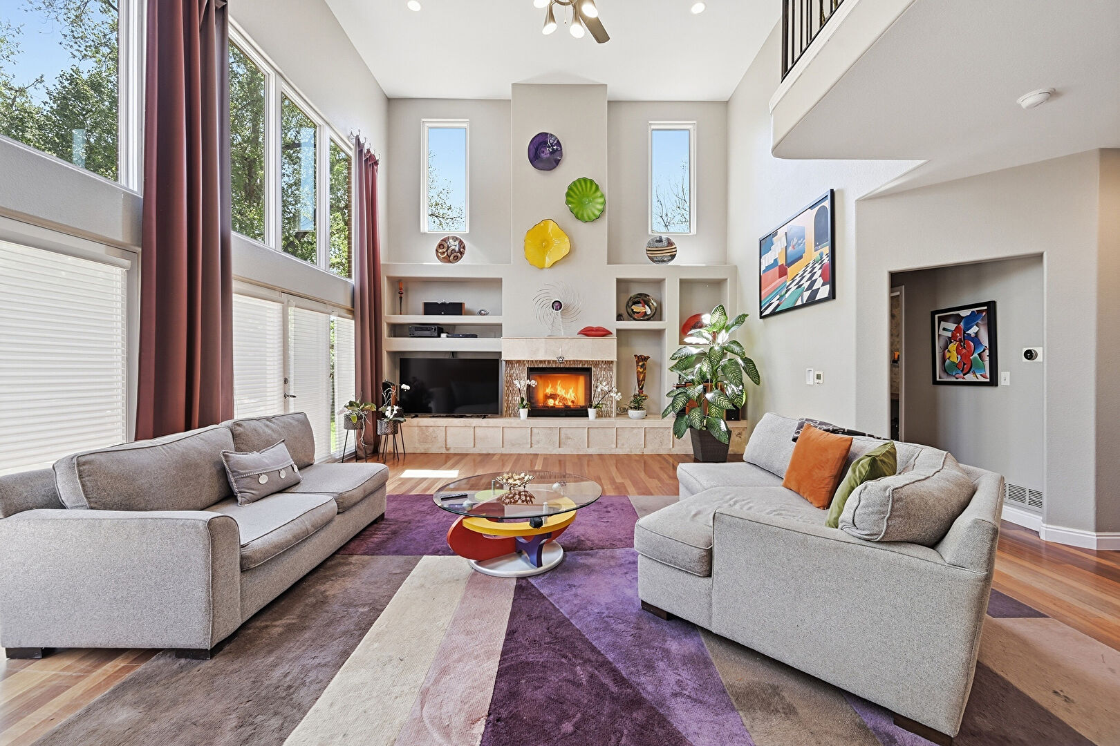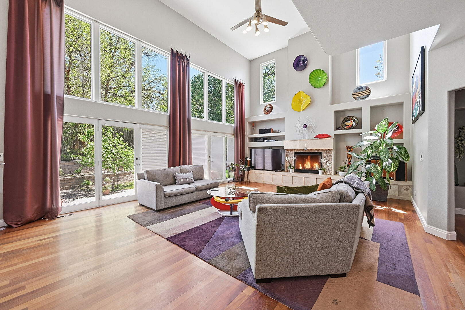 Baseboards Wall, Built In Shelves, Ceiling Fan, Drywall, Fireplace, High Ceiling, L Shaped Kitchen, Natural Light, Recessed Lighting, Vaulted Ceiling, Wood Finish Floor, Drywall, Fireplace, Smoke Carbon Monoxide Detector, Wood Finish Floor