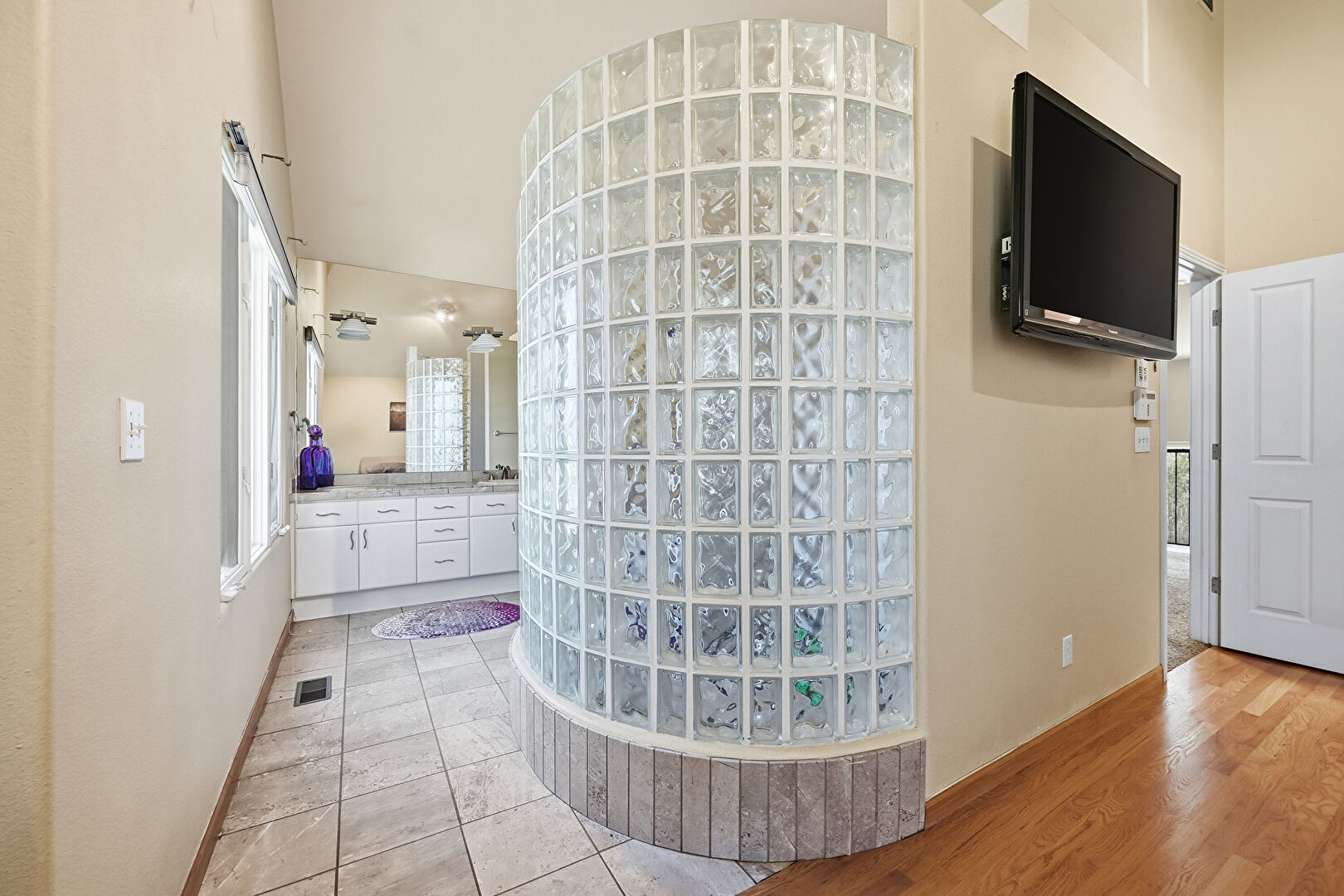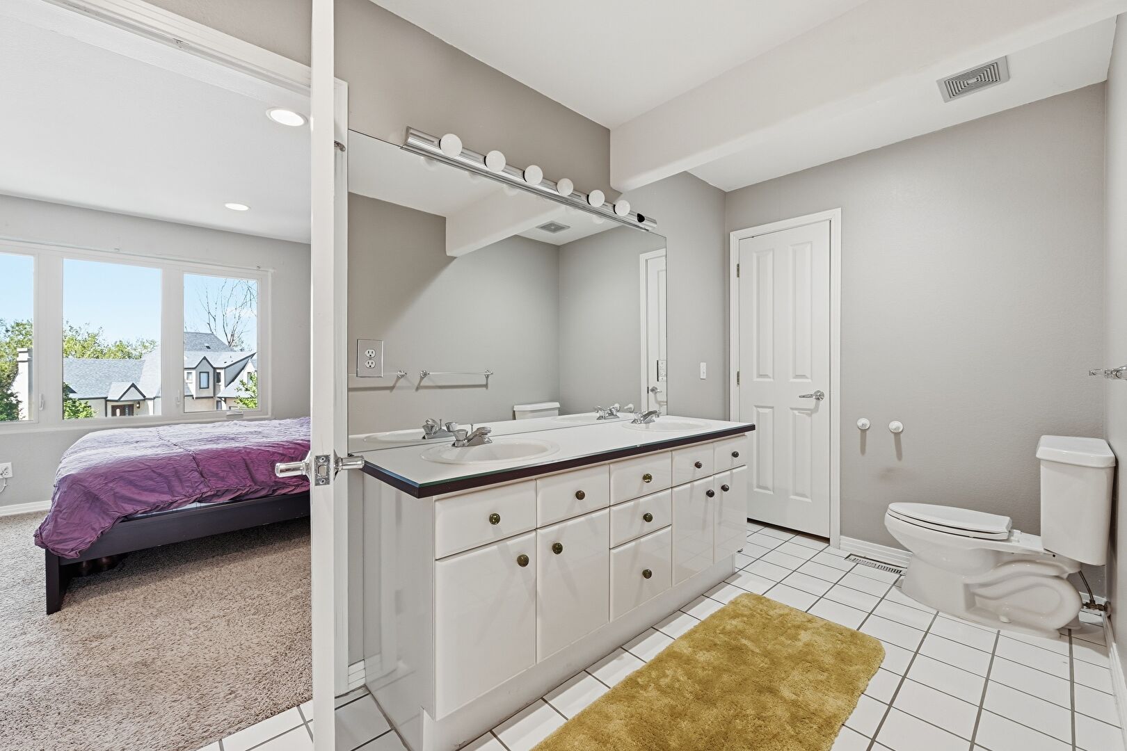 Baseboards Wall, Double Vanity, Drywall, Ensuite Bathroom, Full Bathroom, High Ceiling, Natural Light, Tile Floor, Vanity, Vaulted Ceiling, Vent, Wood Finish Floor, Baseboards Wall, Full Bathroom, Tile Floor, Vaulted Ceiling