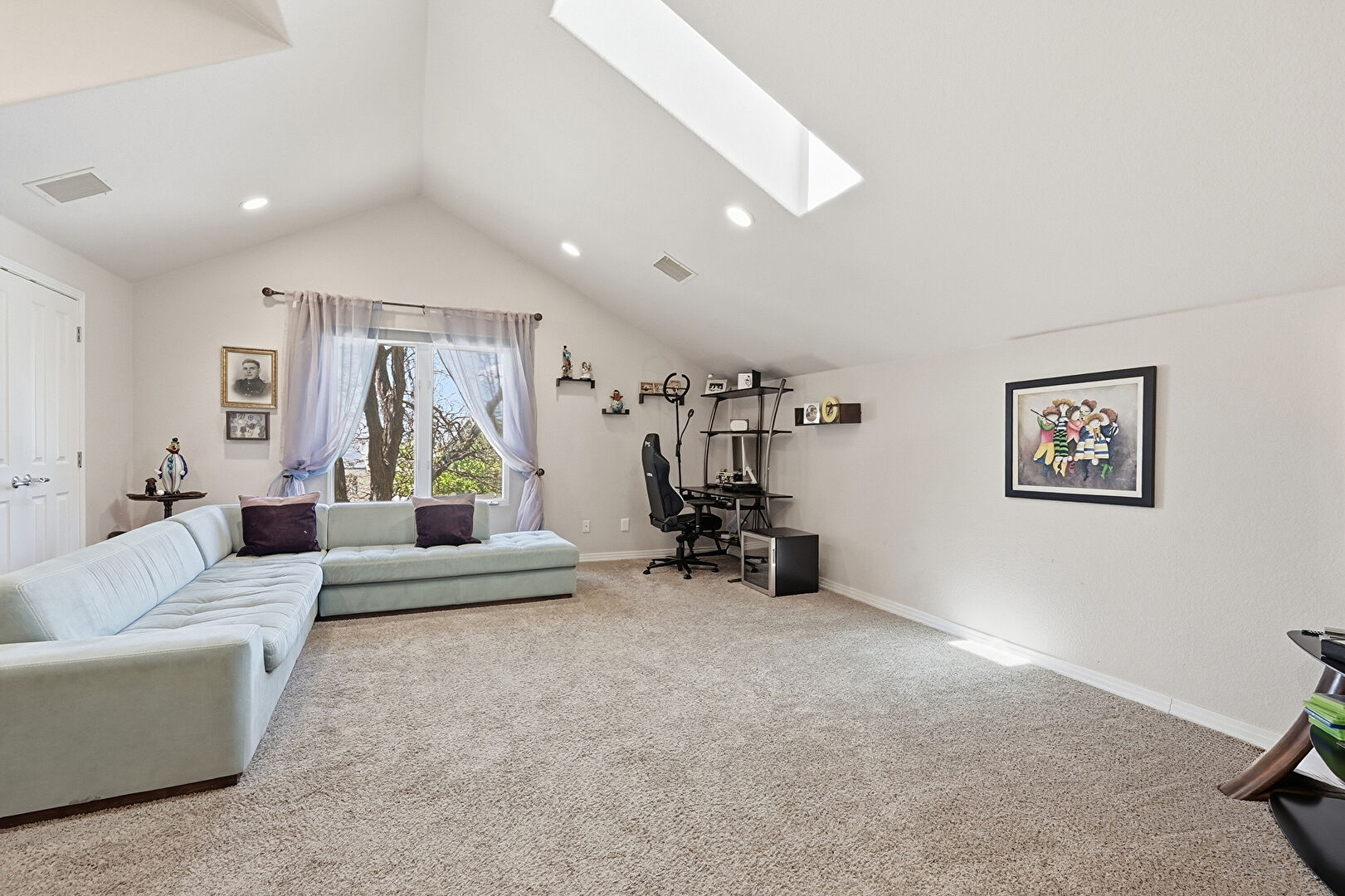 Baseboards Wall, Bonus Room, Carpet, Cathedral Ceiling, Drywall, Office Area, Recessed Lighting, Skylight, Vaulted Ceiling, Vent, Natural Light