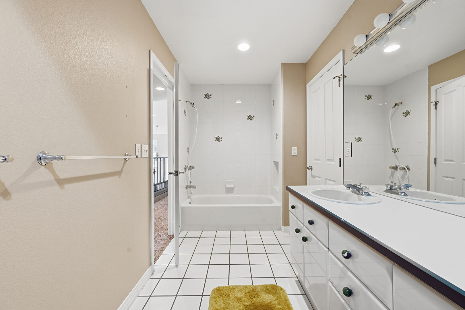 Baseboards Wall, Carpet, Closet, Combined Bath Shower, Double Vanity, Drywall, Ensuite Bathroom, Full Bathroom, Natural Light, Recessed Lighting, Tile Floor, Tile Wall, Vanity, Vent, Drywall, Inlaid Floor, Recessed Lighting