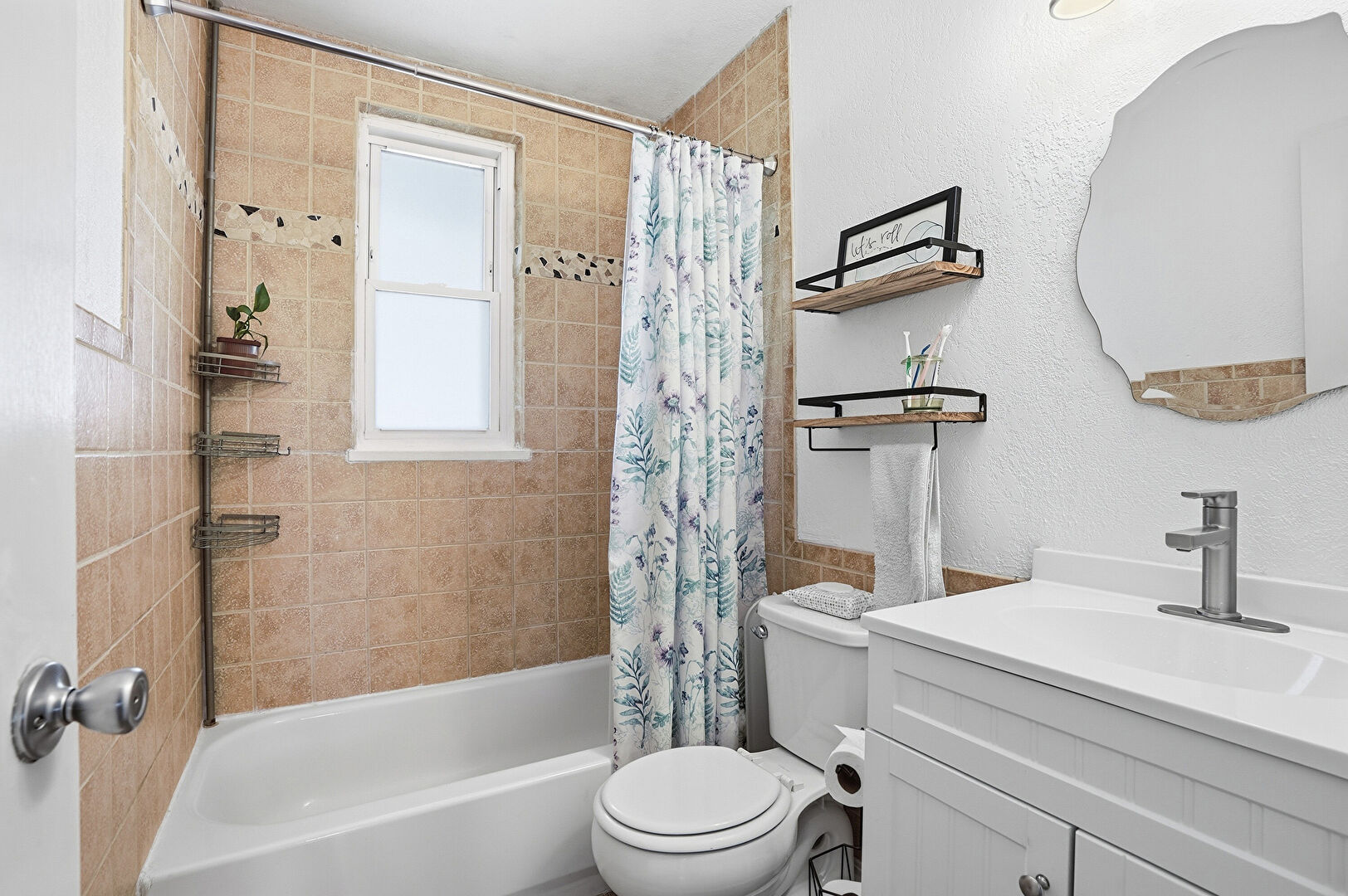 Combined Bath Shower, Full Bathroom, Natural Light, Textured Wall, Vanity, Tile Wall