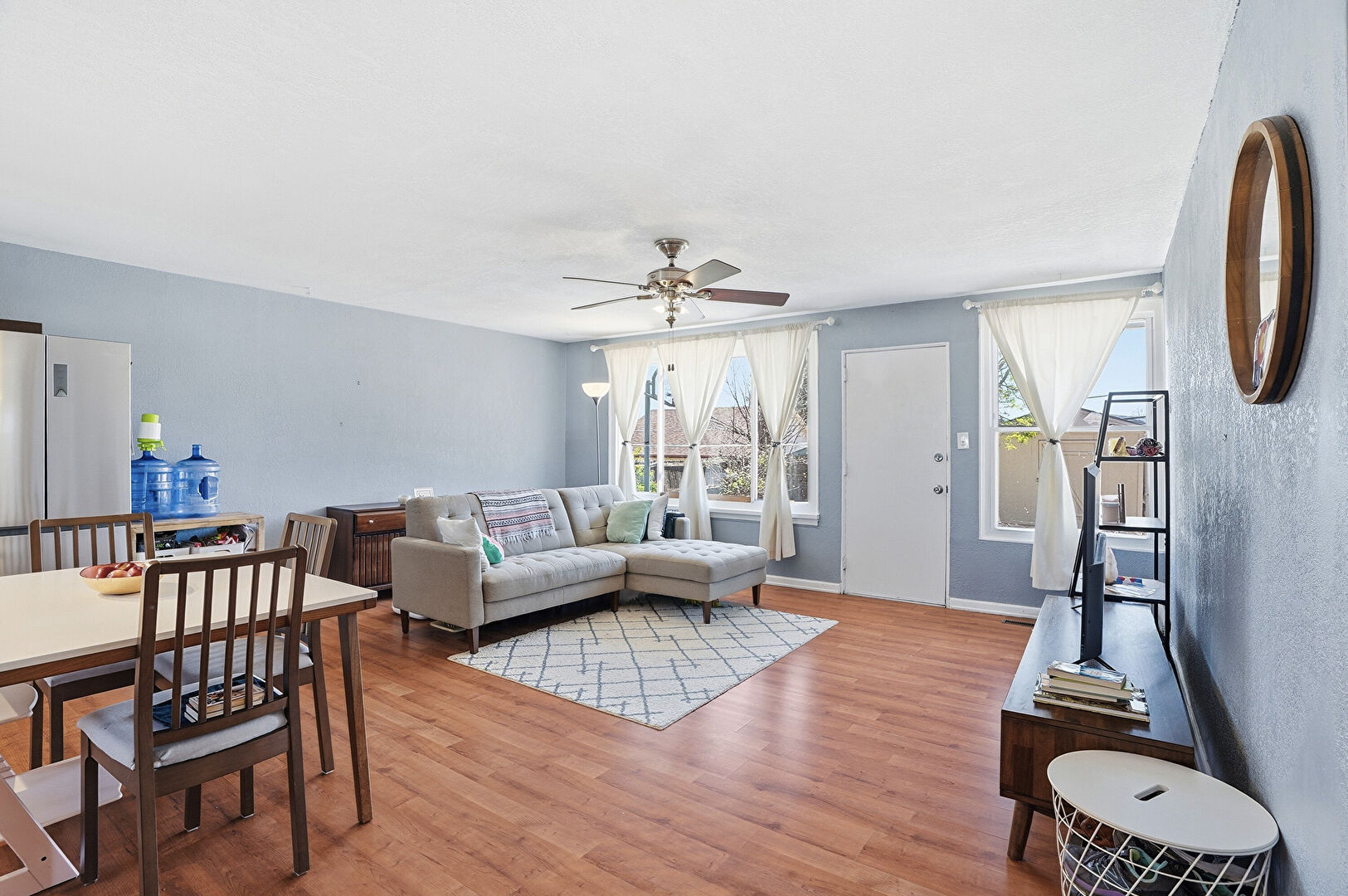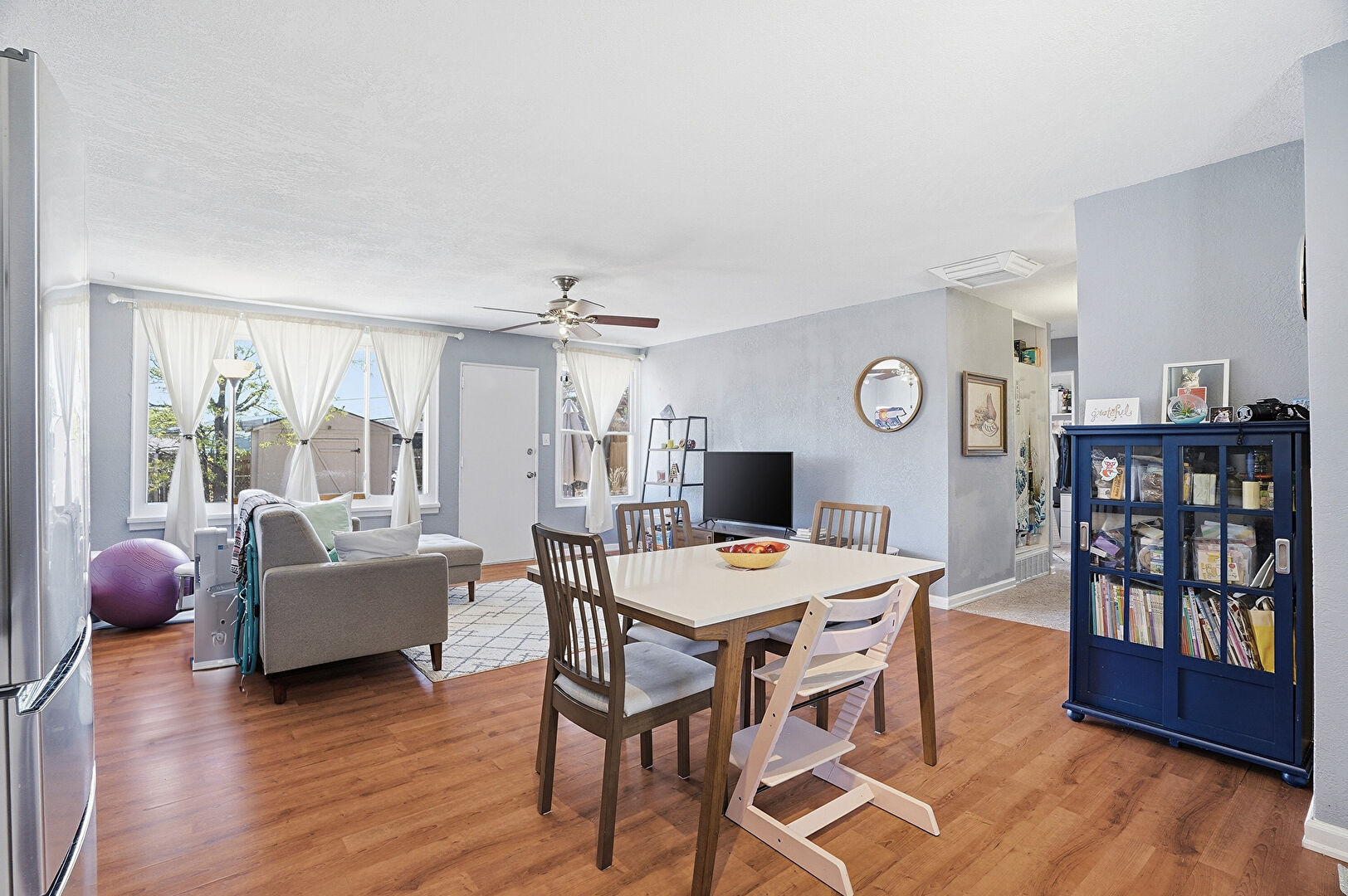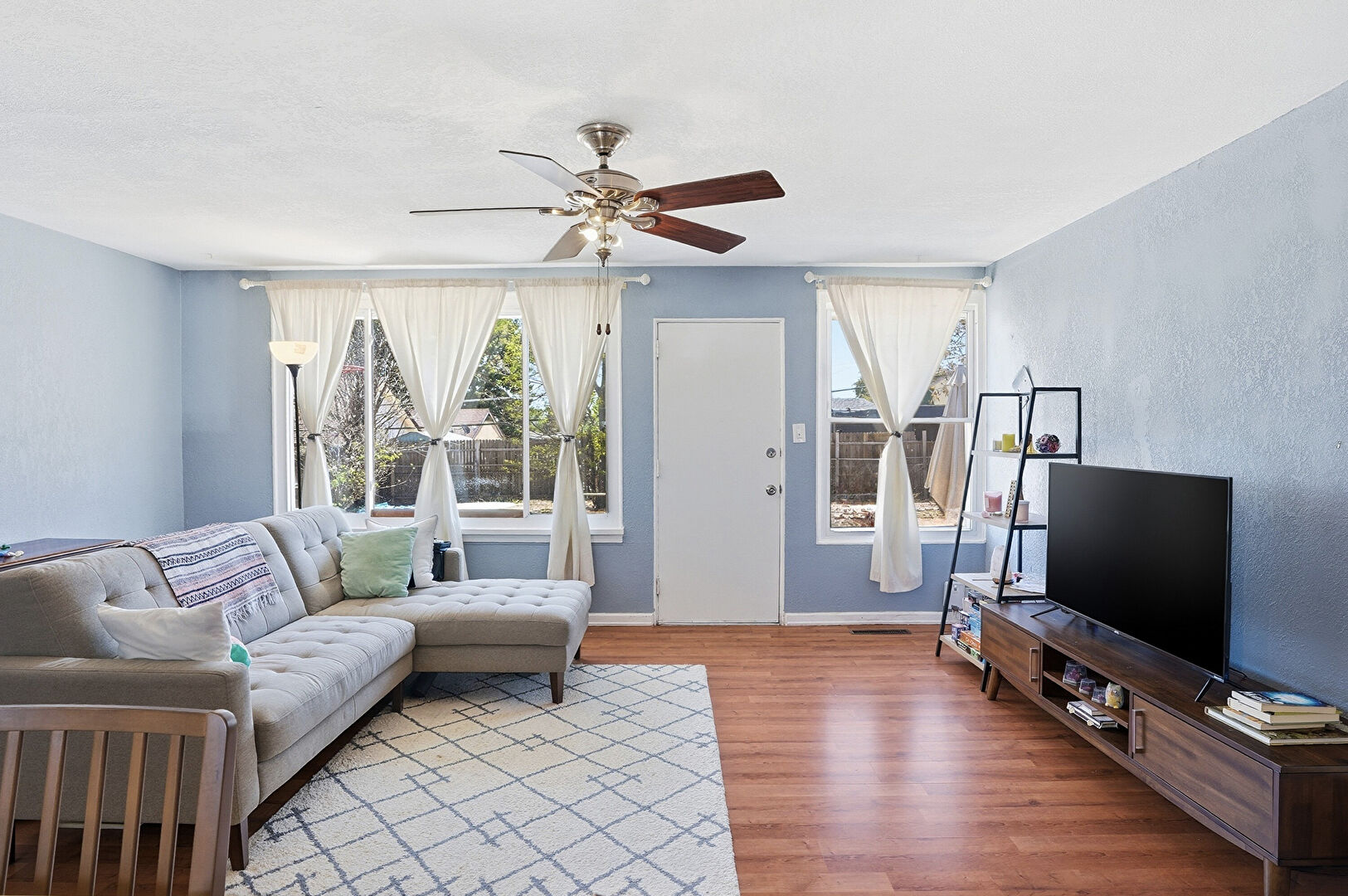 Baseboards Wall, Ceiling Fan, Drywall, Natural Light, Vent, Wood Finish Floor