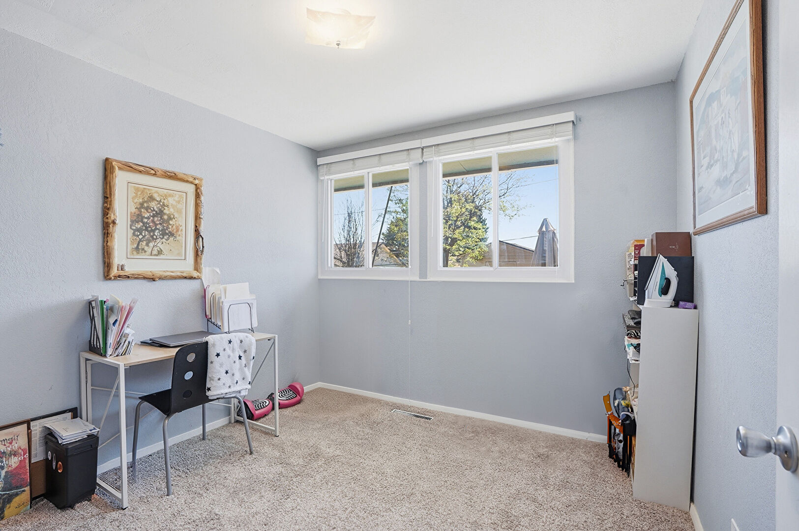 Baseboards Wall, Carpet, Ceiling Fan, Drywall, Natural Light, Office Area, Drywall, Natural Light