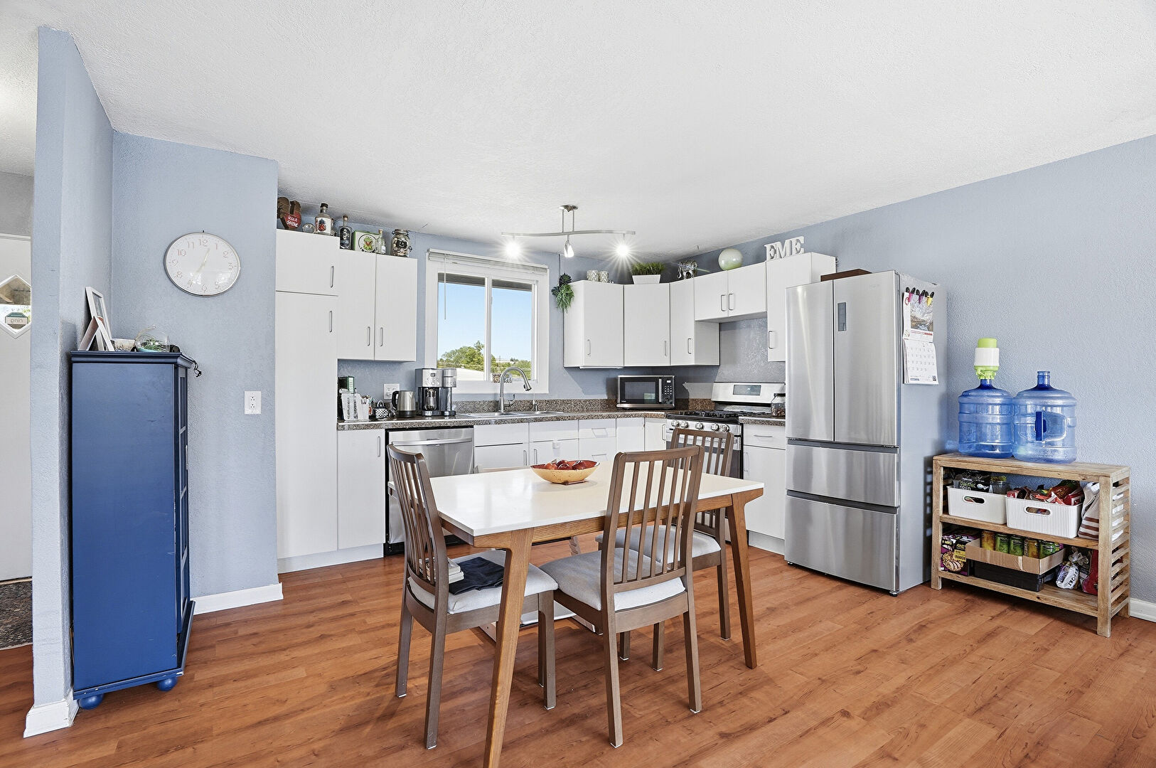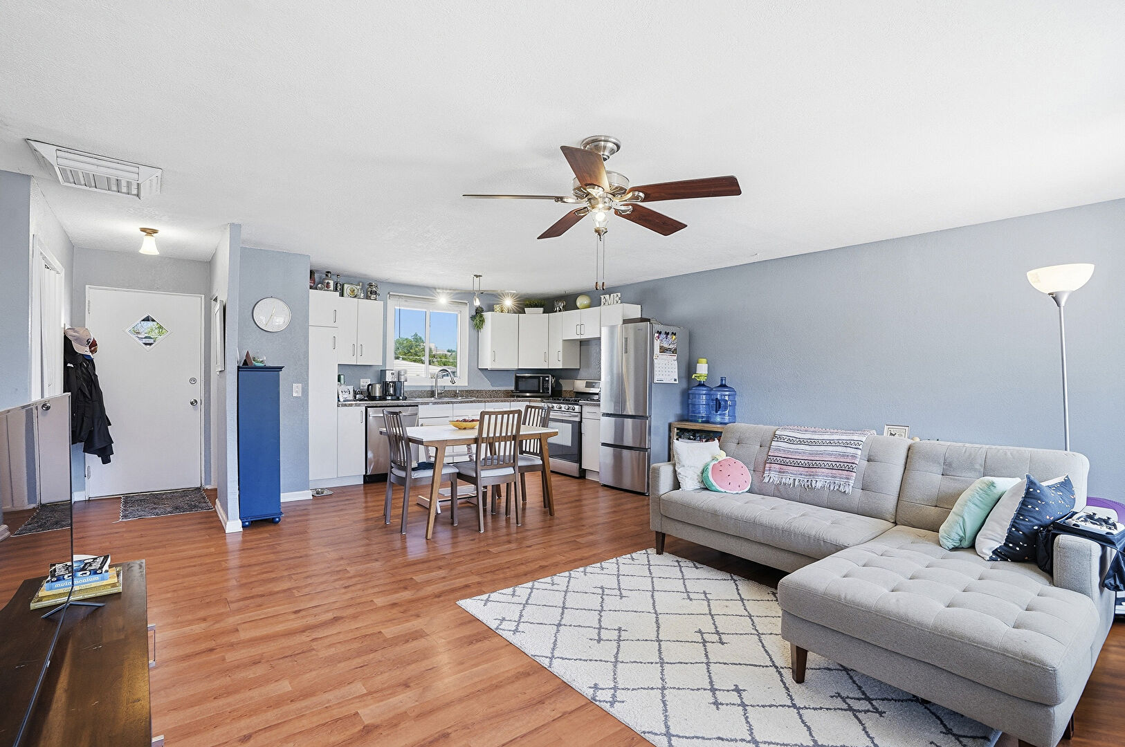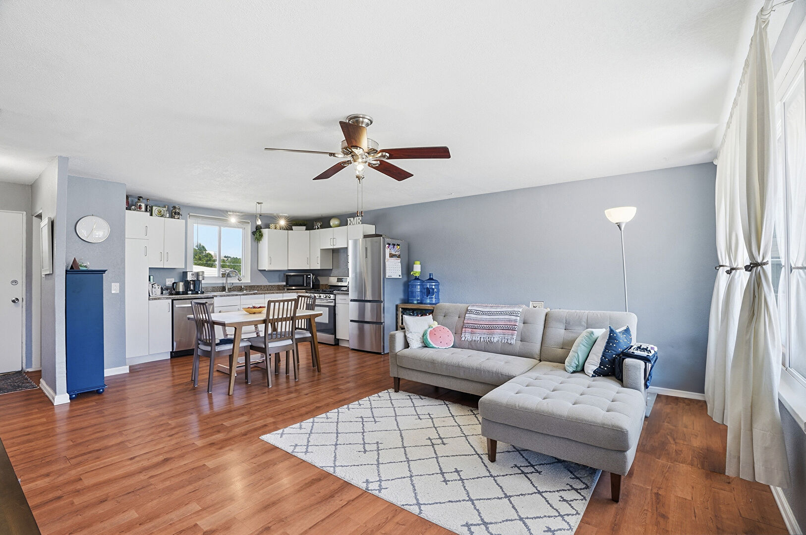 Baseboards Wall, Ceiling Fan, Drywall, L Shaped Kitchen, Natural Light, Textured Wall, Vent, Wood Finish Floor, Baseboards Wall, Drywall, Laundry, Vent, Wood Finish Floor