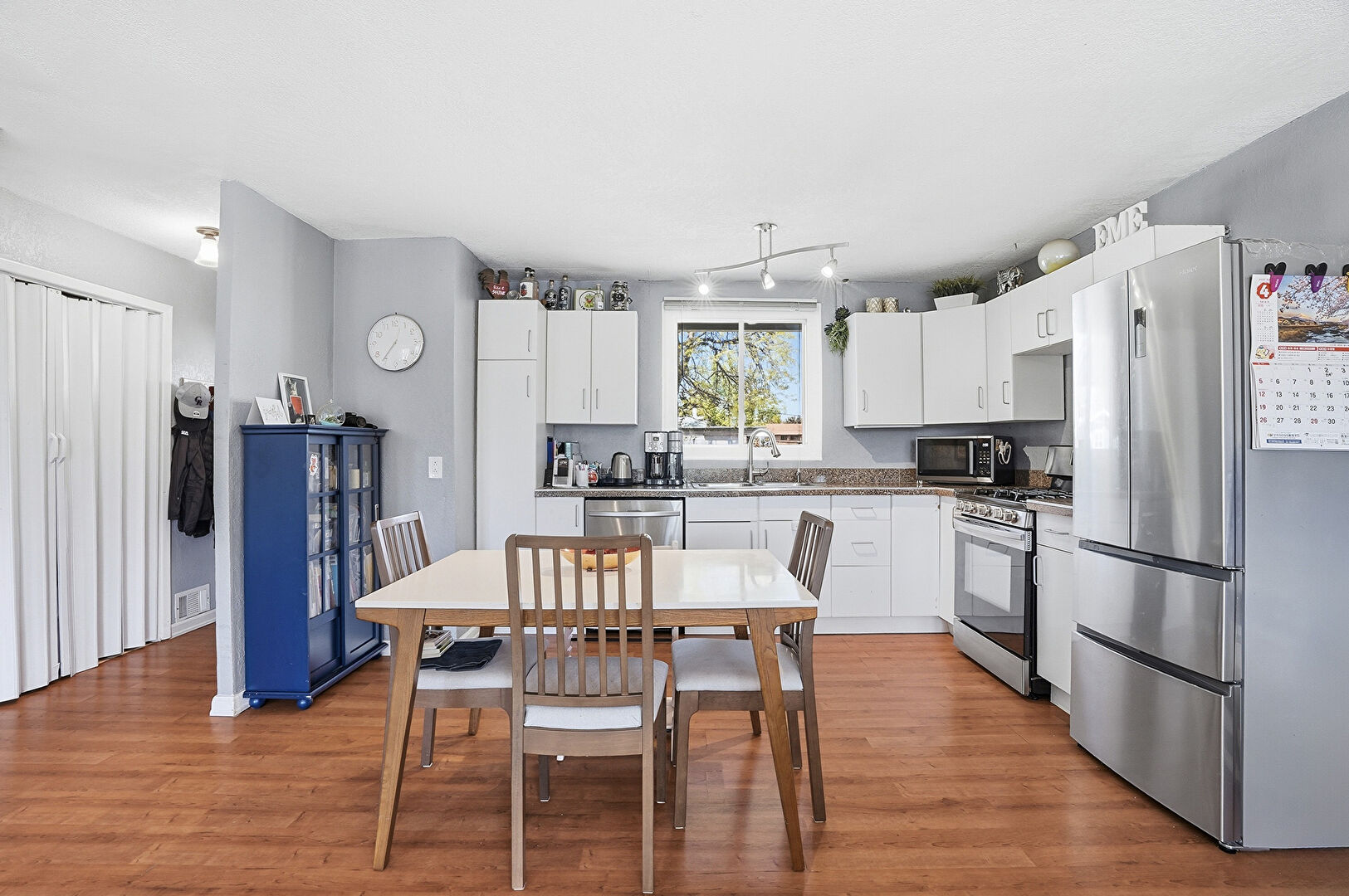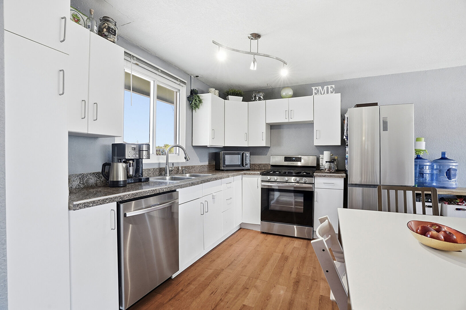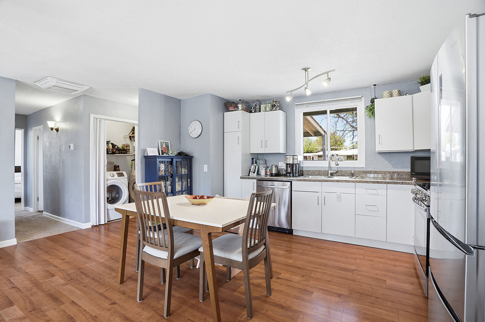 Baseboards Wall, Drywall, L Shaped Kitchen, Laundry, Natural Light, Pendant Lighting, Stone Countertops, Track Lighting, Vent, Washer Dryer, Wood Finish Floor, L Shaped Kitchen, Natural Light, Wood Finish Floor