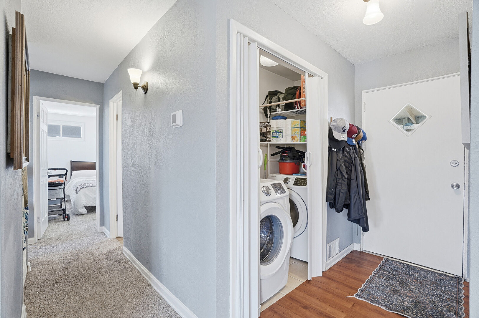 Baseboards Wall, Carpet, Laundry, Vent, Wood Finish Floor, Textured Wall