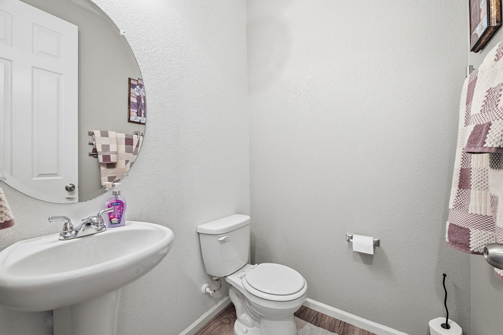 Baseboards Wall, Combined Bath Shower, Full Bathroom, Half Bathroom, Natural Light, Vanity, Vent, Wood Finish Floor, Drywall, Textured Wall
