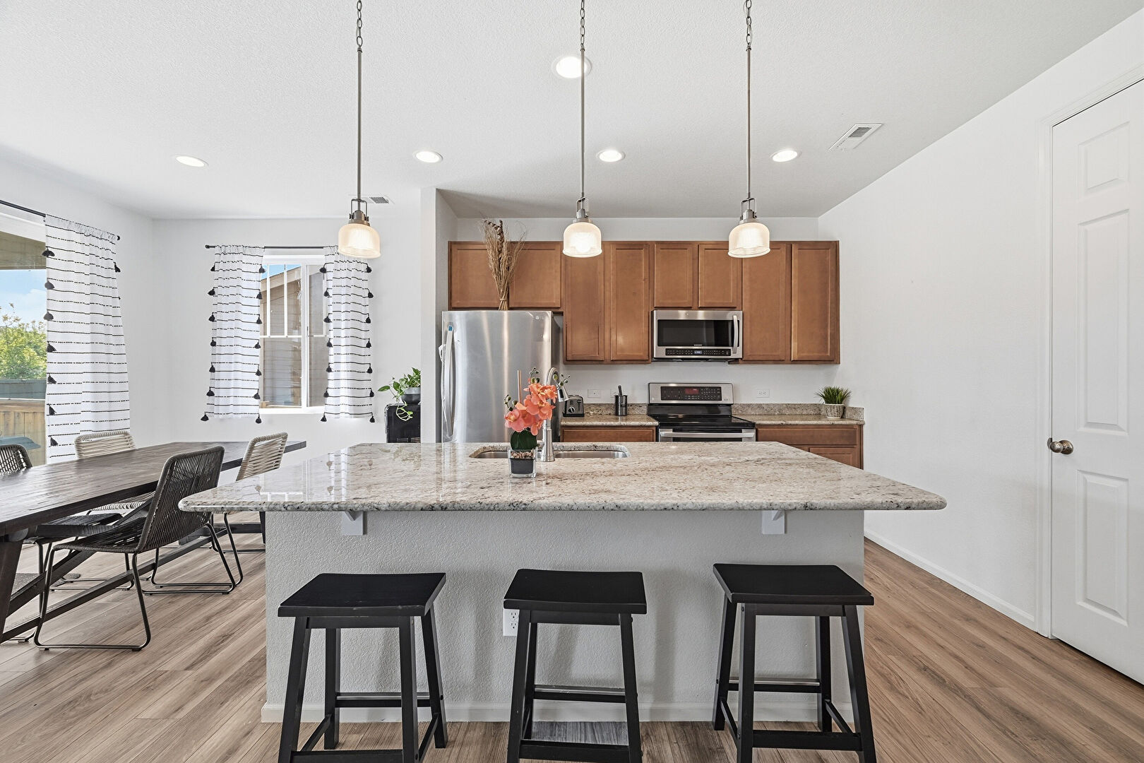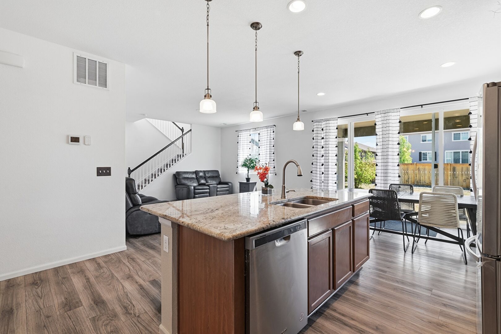 Baseboards Wall, Dark Brown Cabinets, Drywall, Kitchen Bar, Kitchen Island, Medium Brown Cabinets, Natural Light, One Wall Kitchen, Opens To Living Area, Pendant Lighting, Recessed Lighting, Shaker Cabinets, Smoke Carbon Monoxide Detector, Stone Countertops, Vent, Wood Finish Floor, Baseboards Wall, Drywall, Recessed Lighting, Shaker Cabinets, Stone Countertops