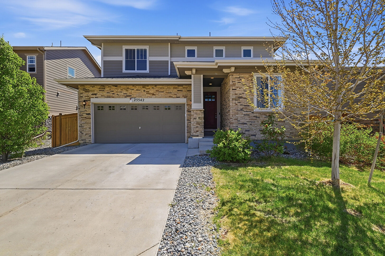 Downspout, Driveway, Gutters, Horizontal Siding, Porch, Stone Siding, Built In Garage