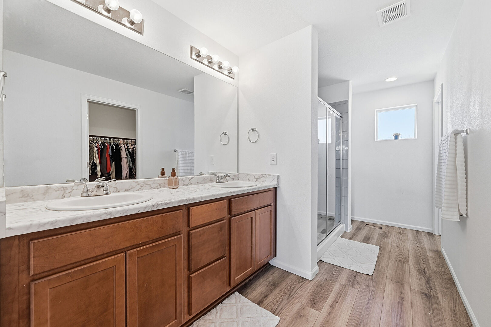 Double Vanity, Drywall, Full Bathroom, Natural Light, Recessed Lighting, Vent, Walk In Closet, Wood Finish Floor, Baseboards Wall