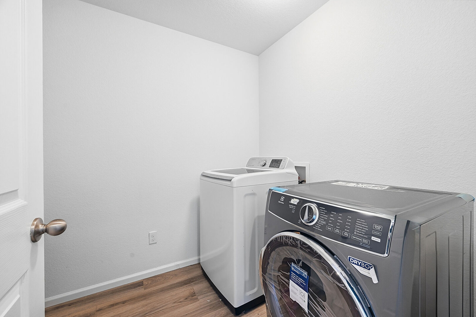 Baseboards Wall, Laundry, Textured Wall, Washer Hookup, Wood Finish Floor, Vaulted Ceiling