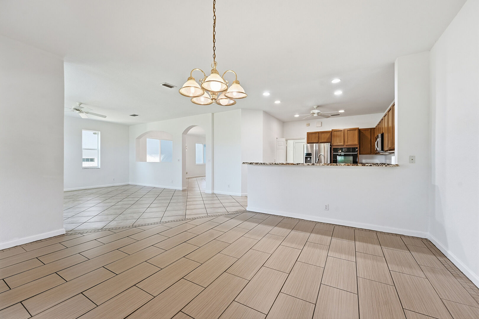 Arched Walkways, Baseboards Wall, Ceiling Fan, Drywall, Natural Light, Notable Chandelier, Recessed Lighting, Stairs, Tile Floor, Vent, Drywall, Vent