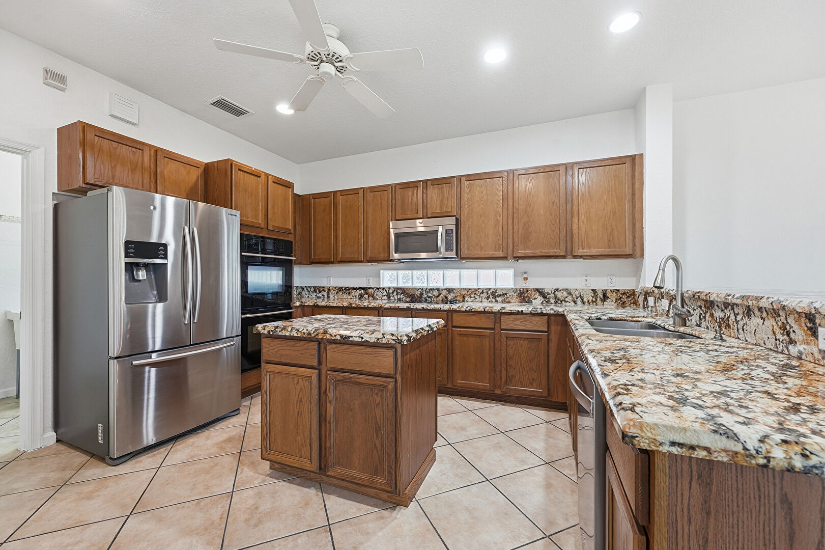 Baseboards Wall, Ceiling Fan, Double Oven, Drywall, Kitchen Island, Kitchen Peninsula, Medium Brown Cabinets, Natural Light, Notable Chandelier, Opens To Living Area, Pendant Lighting, Recessed Lighting, Shaker Cabinets, Stone Countertops, Tile Floor, U Shaped Kitchen, Vent, Kitchen Island, Kitchen Peninsula