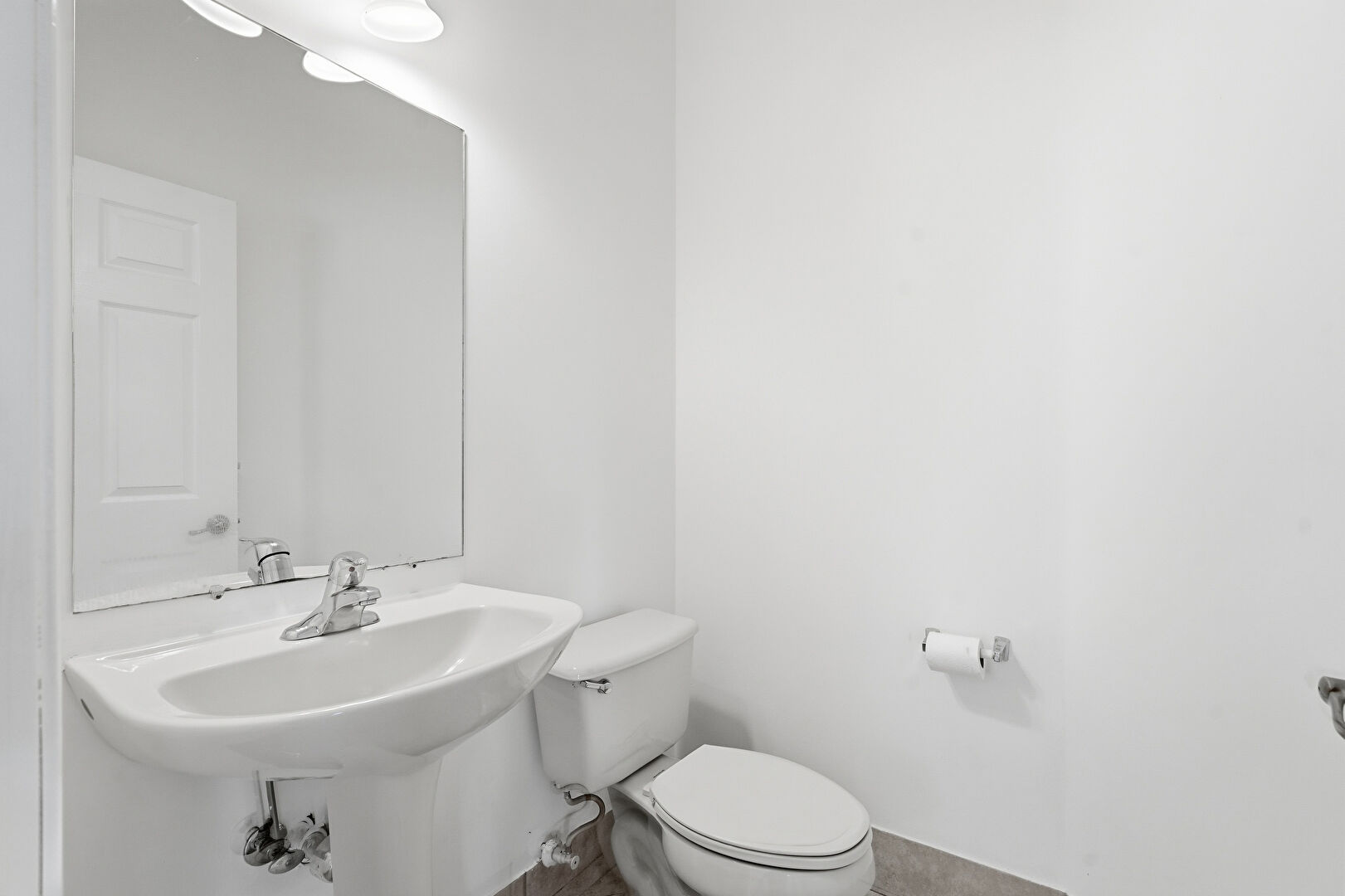 Baseboards Wall, Combined Bath Shower, Double Vanity, Drywall, Full Bathroom, Natural Light, Tile Floor, Vanity, Vent, Half Bathroom, Tile Floor, Vent