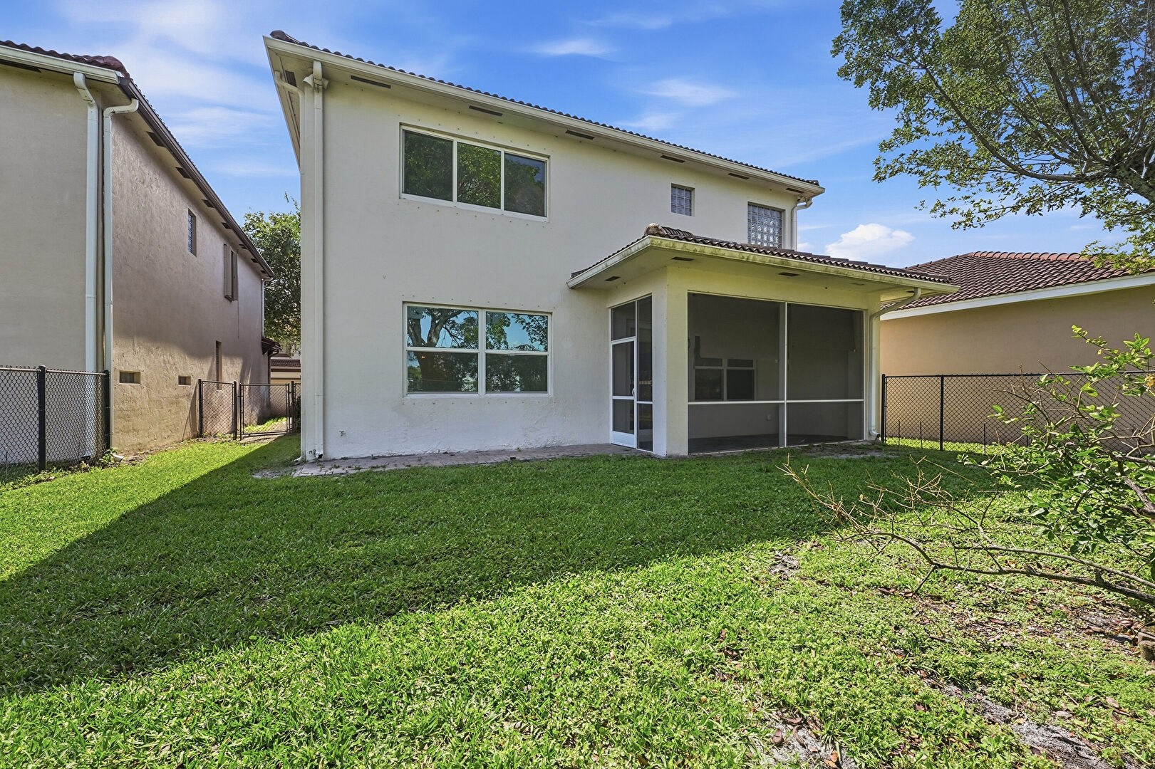 Downspout, Fence, Gutters, Lawn, Stucco Siding, Sunroom