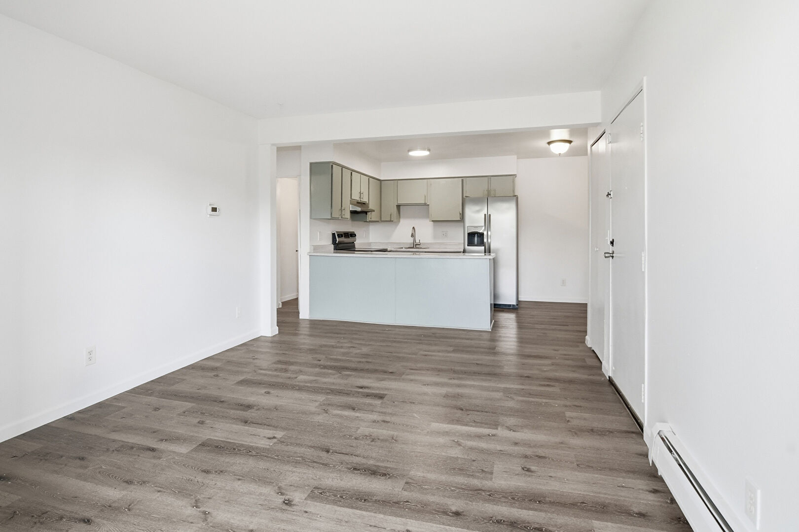 Access To Exterior, Apartment Complex View, Baseboard Radiator, Baseboards Wall, Drywall, Gray Cabinets, Kitchen Peninsula, Natural Light, Opens To Living Area, Shaker Cabinets, Smoke Carbon Monoxide Detector, U Shaped Kitchen, Wall Mounted Ac, Wood Finish Floor, Drywall, Gray Cabinets, Natural Light, Opens To Living Area, Parking Lot