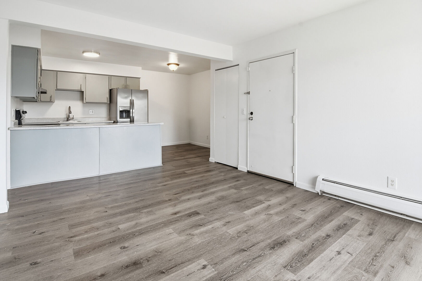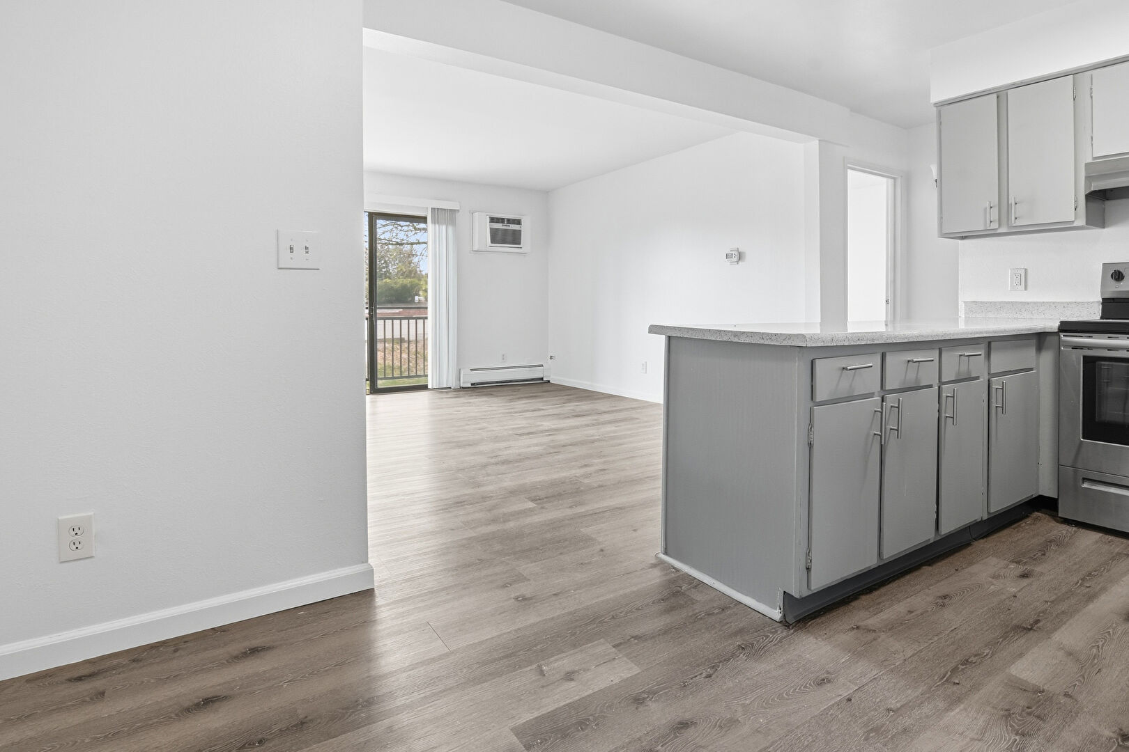 Barn Door, Baseboard Radiator, Baseboards Wall, Drywall, Gray Cabinets, Kitchen Peninsula, Natural Light, Visible Hinge Cabinets, Wall Mounted Ac, Wood Finish Floor, Baseboards Wall, Drywall, Opens To Living Area