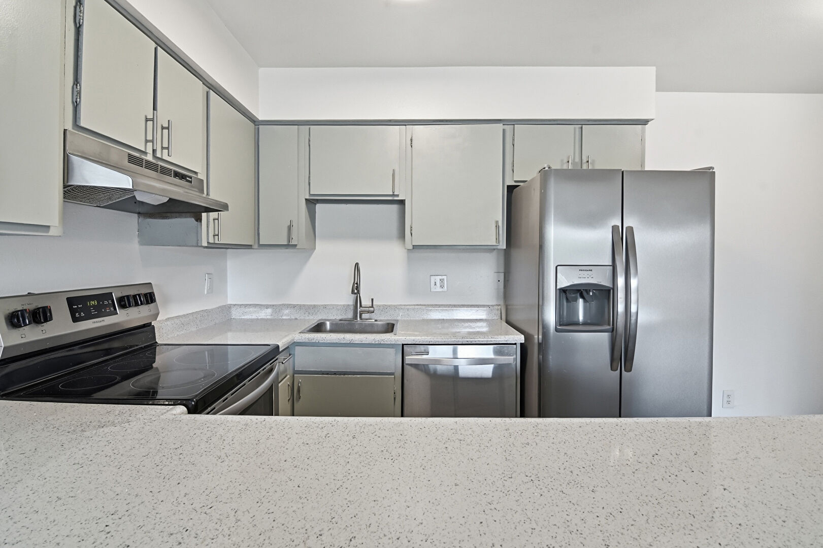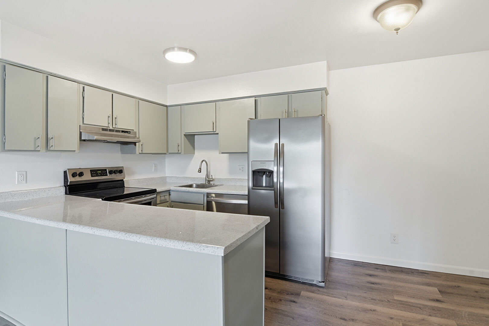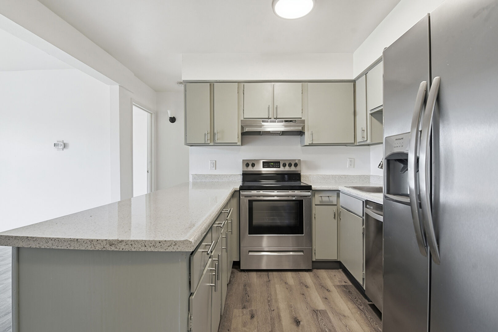 Drywall, Gray Cabinets, Kitchen Peninsula, Stone Countertops, U Shaped Kitchen, Visible Hinge Cabinets, Wood Finish Floor, Baseboards Wall, Gray Cabinets, Visible Hinge Cabinets