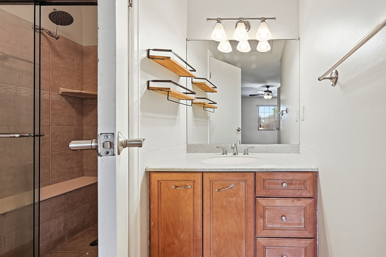 Ceiling Fan, Drywall, Natural Light, Vanity, Full Bathroom